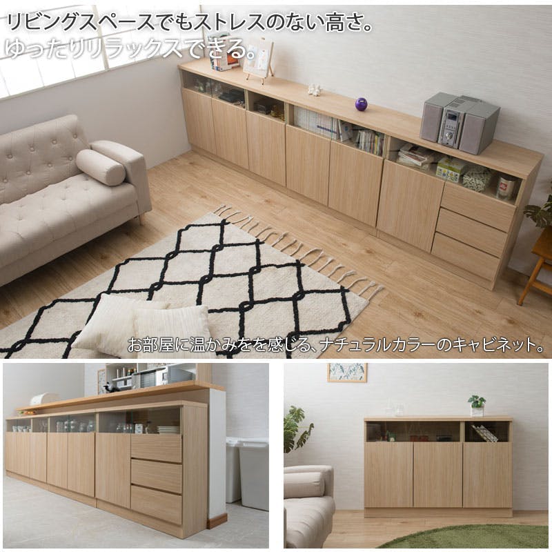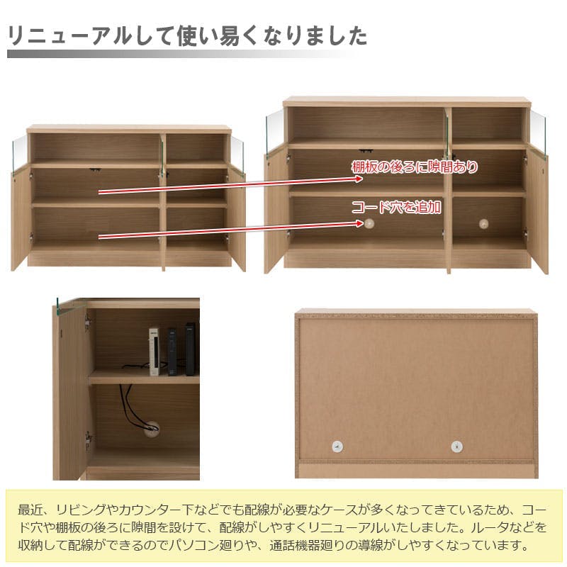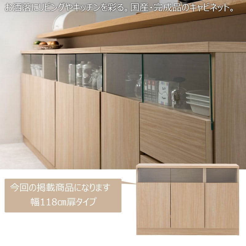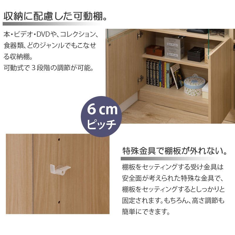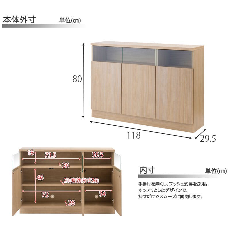 ■商品サイズ/本体:(約)幅118×奥行29.5×高さ80cm■ガラス部内寸/(約)幅(大)73.5(小)35.5×奥行26×高さ18cm■扉内寸/(約)幅(大)72(小)34×奥行26(棚板21後部1cm配線用隙間あり)×高さ46cm■棚板/可動式(大)(小)各1枚(6cmピッチ・3段階)■耐荷重量/天板:(約)20kg、棚板:(約)5kg■商品重量/(約)28kg■日本製■完成品