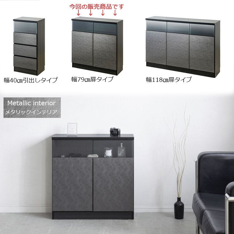 薄型リビングボード 幅79 奥行30 扉タイプ サイドボード キャビネット シルバーメタリック 日本製 完成品 大川家具 リビング収納 収納家具 収納 棚 木製 北欧 おしゃれ シンプル モダン リビング カウンター下収納 食器棚 キッチン ガラスキャビネット