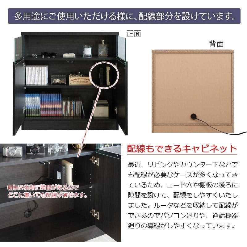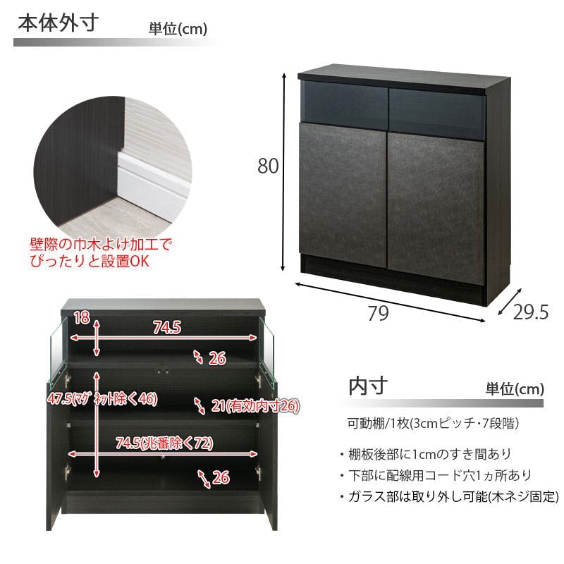 ■商品サイズ/本体:(約)幅79×奥行29.5×高さ80cm■ガラス部内寸/(約)幅74.5×奥行26×高さ18cm■扉内寸/(約)幅74.5(兆番除く72)×奥行26(棚板21後部1cm配線用隙間あり)×高さ47.5cm■棚板/可動式1枚(3cmピッチ・7段階)■耐荷重量/天板:(約)20kg、棚板:(約)5kg■商品重量/(約)17kg■日本製■完成品