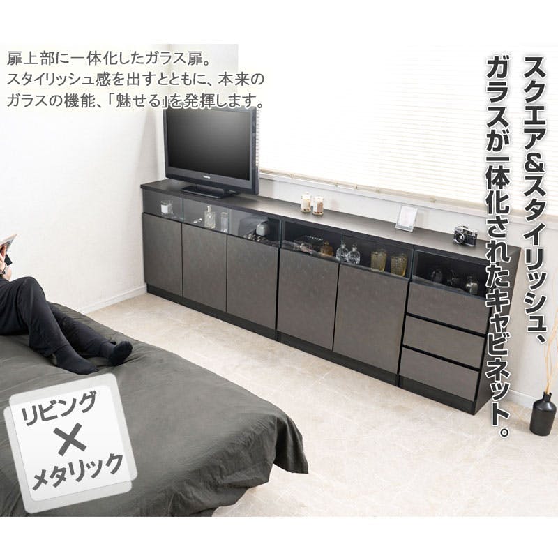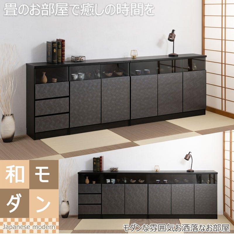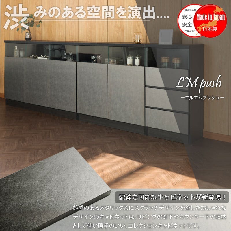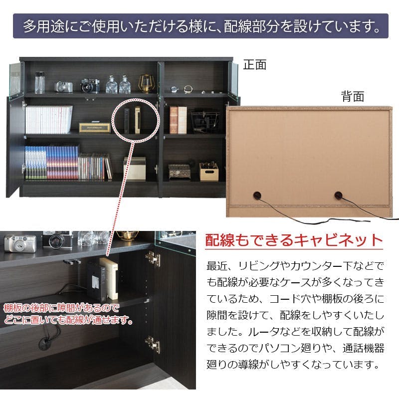 ■商品サイズ/本体:(約)幅118×奥行29.5×高さ80cm■ガラス部内寸/(約)幅(大)74.5(小)35.5×奥行26×高さ18cm■扉内寸/(約)幅(大)74.5(兆番除く72)(小)35.5(兆番除く34)×奥行26(棚板21後部1cm配線用隙間あり)×高さ47.5cm■棚板/可動式(大)(小)各1枚(3cmピッチ・7段階)■耐荷重量/天板:(約)20kg、棚板:(約)5kg■商品重量/(約)24kg■日本製■完成品