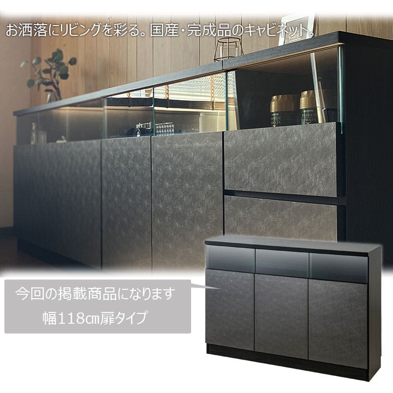 薄型リビングボード 幅118 奥行30 扉タイプ サイドボード キャビネット シルバーメタリック 日本製 完成品 大川家具 リビング収納 収納家具 収納 棚 木製 北欧 おしゃれ シンプル モダン リビング カウンター下収納 食器棚 キッチン ガラスキャビネット