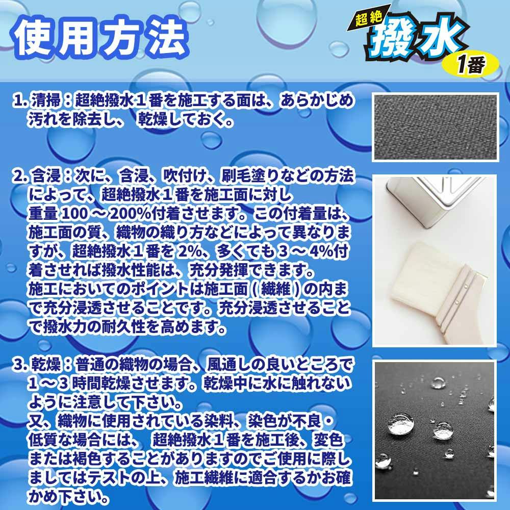 1.清掃:超絶撥水1番を施工する面は、あらかじめ汚れを除去し、乾燥しておく。2.含浸:次に、含浸、吹付け、刷毛塗りなどの方法によって、超絶撥水1番を施工面に対し重量で100〜200%付着させます。この付着量は、施工面の質、織物の織り方などによって異なりますが、超絶撥水1番を2%、多くても3〜4%付着させれば撥水性能は、充分発揮できます。施工においてのポイントは施工面(繊維)の内部まで充分浸透させることです。充分浸透させることで撥水力の耐久性を高めます。