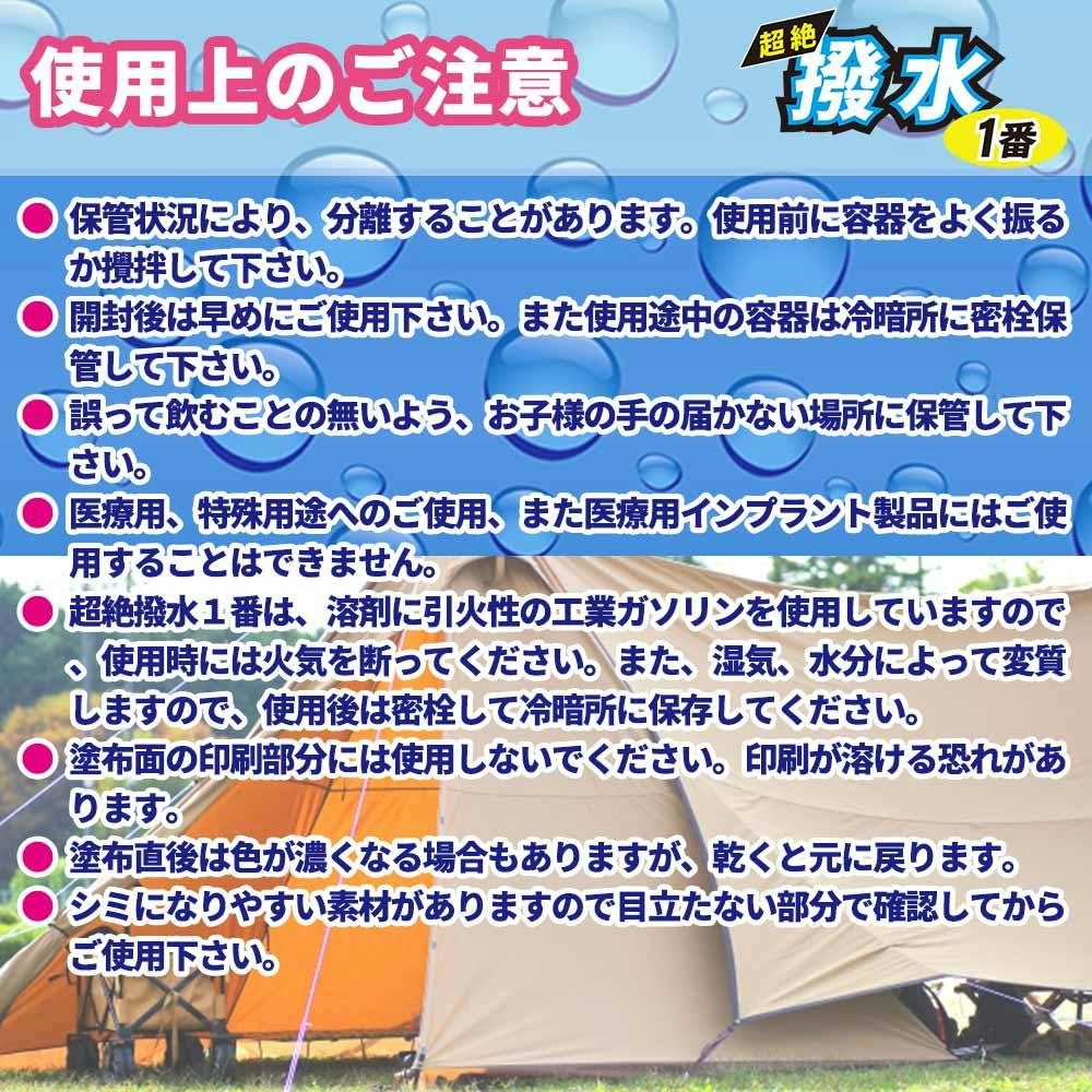 ●保管状況により、分離することがあります。使用前に容器をよく振るか攪拌して下さい。●開封後は早めにご使用下さい。また使用途中の容器は冷暗所に密栓保管して下さい。●誤って飲むことの無いよう、お子様の手の届かない場所に保管して下さい。●医療用、特殊用途へのご使用、また医療用インプラント製品にはご使用することはできません。●超絶撥水1番は、溶剤に引火性の工業ガソリンを使用していますので、使用時には火気を断ってください。また、湿気、水分によって変質しますので、使用後は密栓して冷暗所に保存してください。