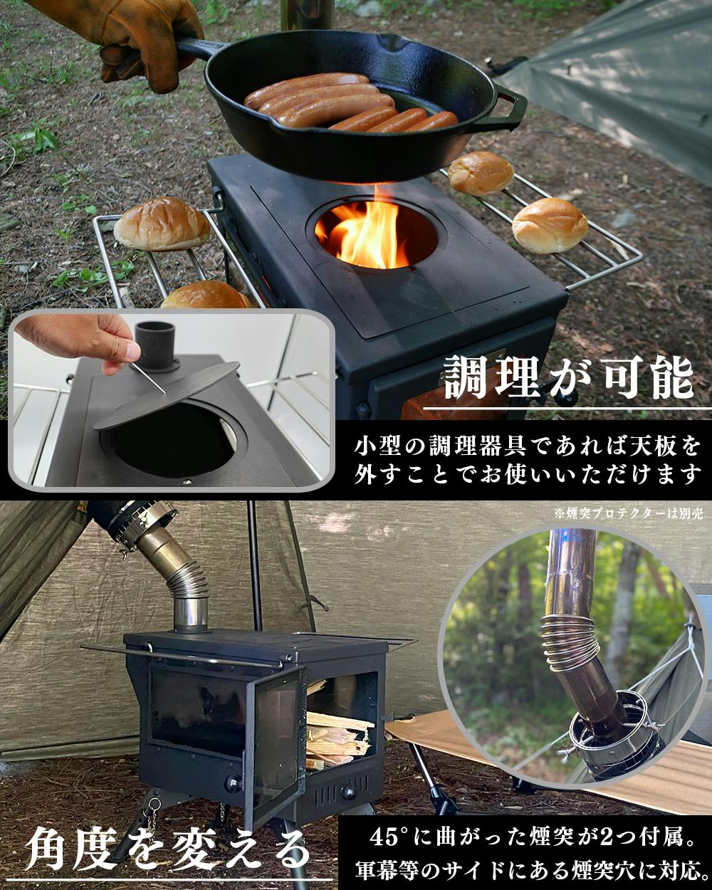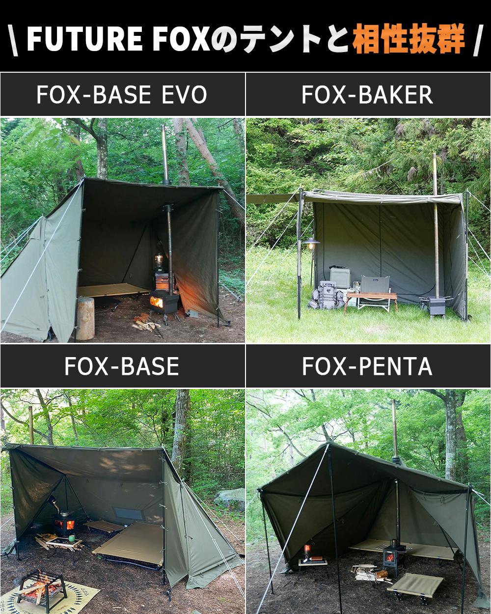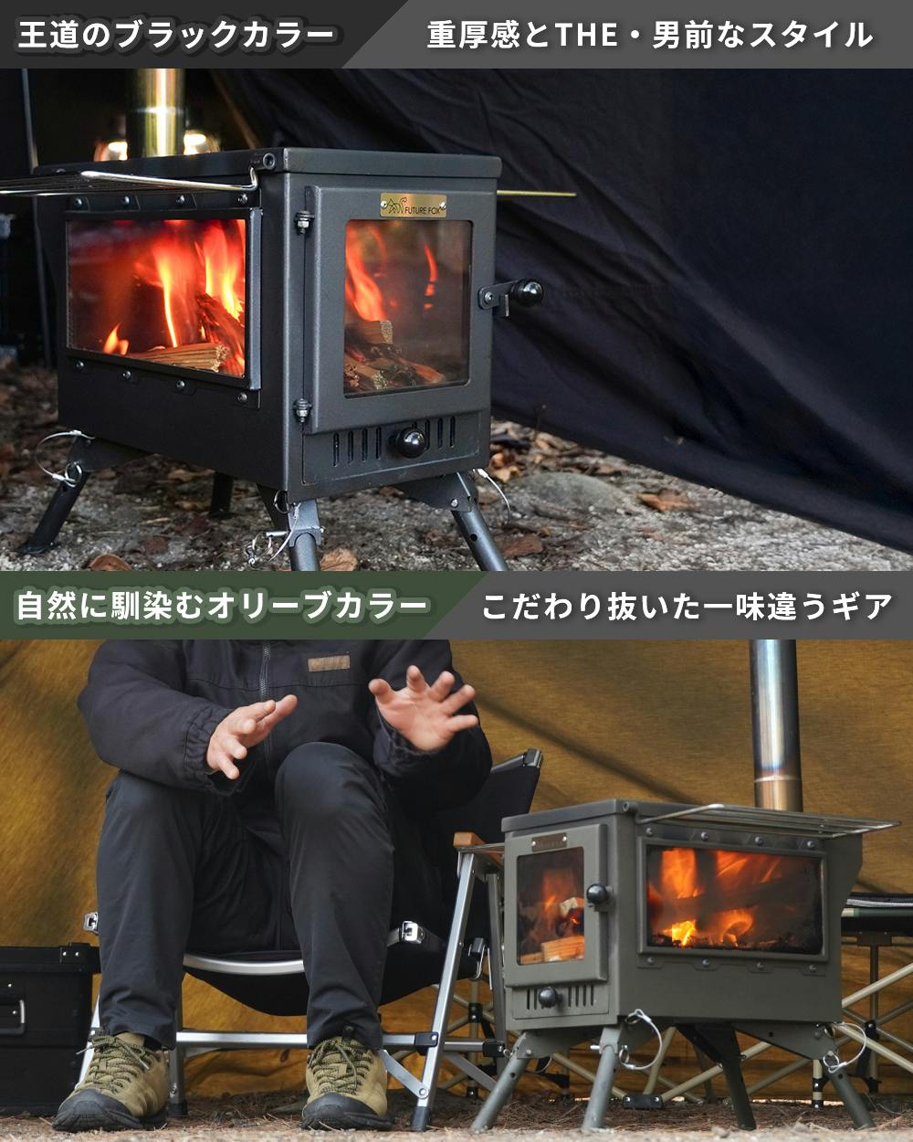 FUTURE FOX 薪ストーブ テントストーブ 折りたたみ式 煙突付属 3面ガラス 調理可能 鉄製 最大52.5×40×263cm