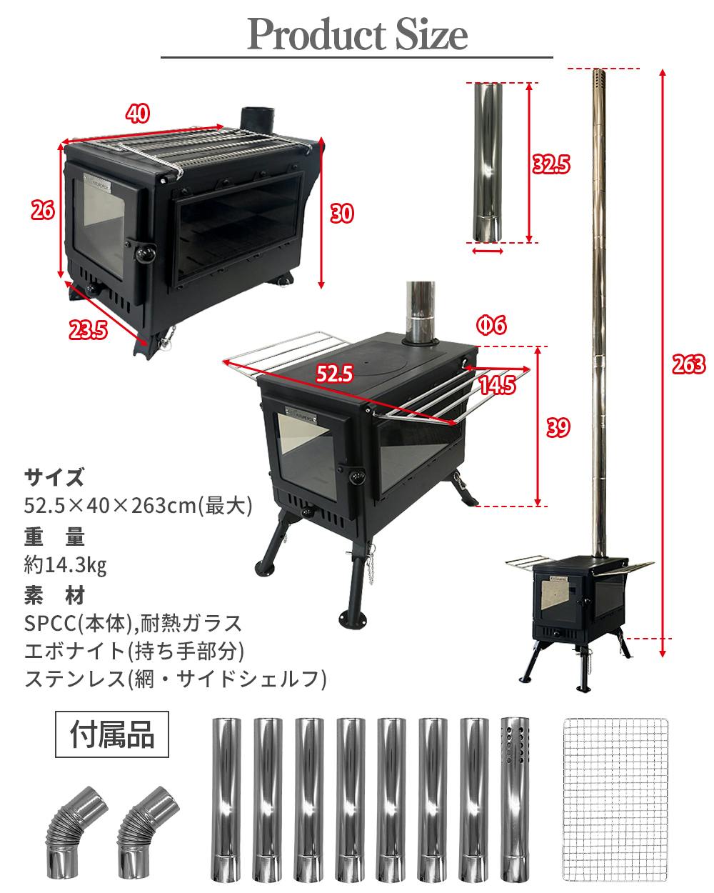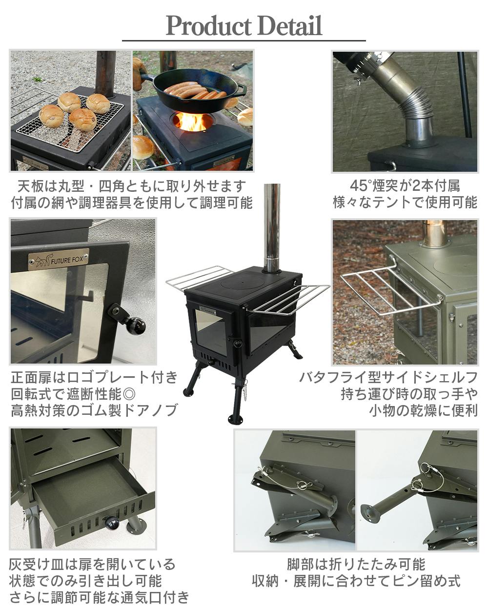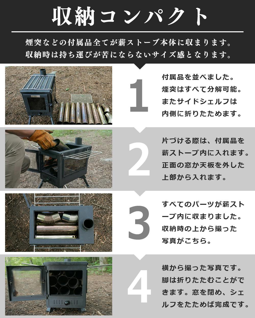 FUTURE FOX 薪ストーブ テントストーブ 折りたたみ式 煙突付属 3面ガラス 調理可能 鉄製 最大52.5×40×263cm