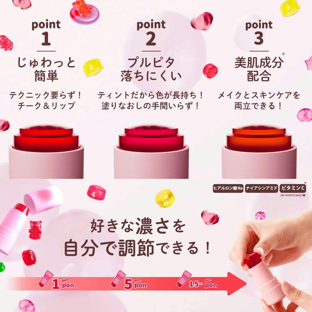 じゅわっとチーク&リップぷるん 弾む ぷにぷにグミティント優雅でガーリーなピーチピンク。●ぷにっとした質感と、はじけるジューシーカラーが特徴。じゅわっと内側から染み出すような発色で、自然でピュアな印象に。●ポンポンするだけ!テクニック不要で簡単に新感触メイクが楽しめます。●色長持ち!ティントなので色落ちしにくく、塗り直しの手間がかかりません。●保湿成分配合でメイクしながらスキンケア。※ヒアルロン酸Na、ナイアシンアミド、ビタミンC
