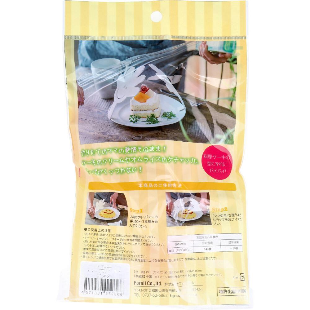 (1)お皿のフチに「ママの手」を2~3枚挟み込んでください。(2)「ママの手」を覆うようにラップをおかけください。