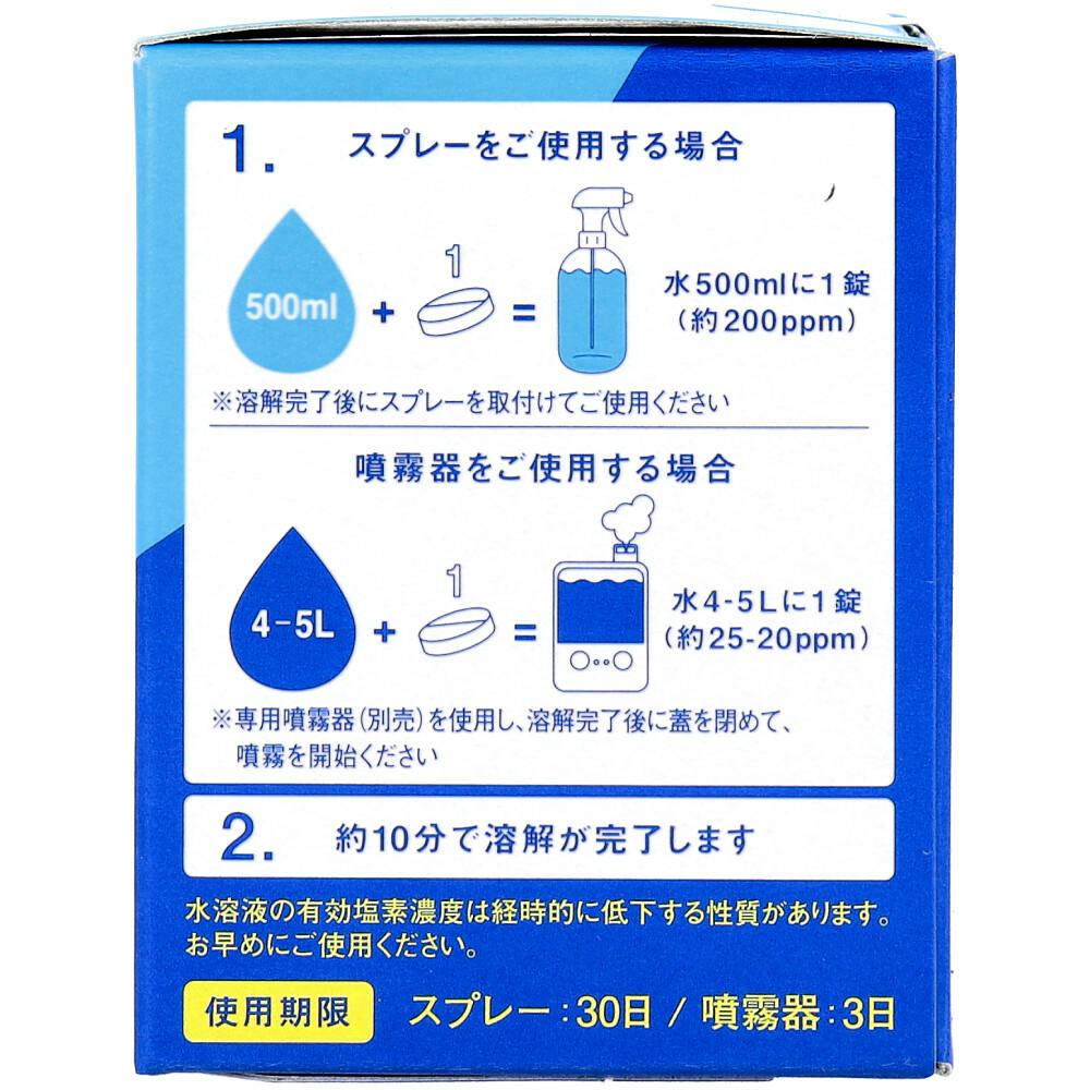 ウイルス・菌・ニオイを除去。使いたい時にタブレット(錠剤)を水道水に溶かして作る、新鮮な次亜塩素酸水生成剤の10錠入り。タブレットは長期保管が可能なので、いざという時の防災用備蓄にも最適です。●簡単!1錠を水道水に溶かすだけ!・スプレーの場合:水500mLに1錠(約200ppm/pH6±0.5(生成時))・専用噴霧器の場合:水4~5Lに1錠(約25-20ppm/pH6±0.5(生成時))●生成された次亜塩素酸水溶液が、気になるウイルス・菌・ニオイを除去します。※第三者機関にて