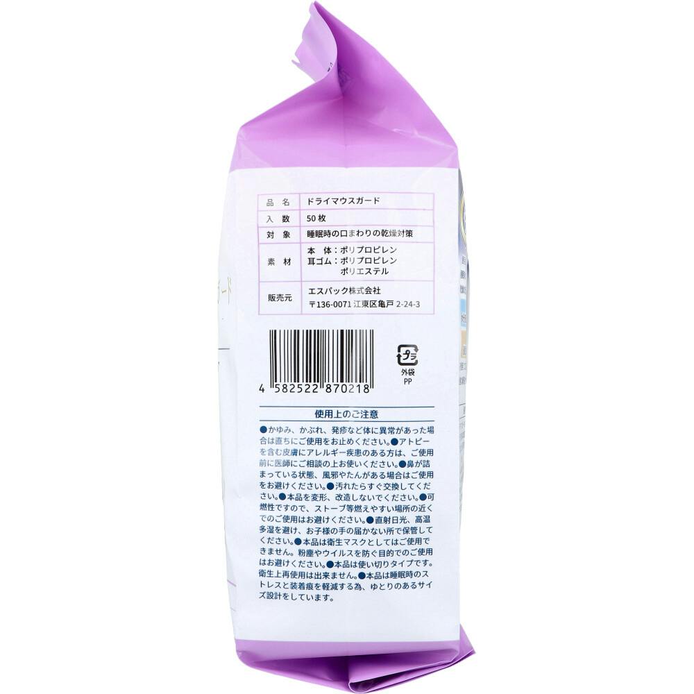 睡眠時の喉・肌・唇乾燥ケア。快眠サポート。●内生地:水分を逃しにくい親水性生地、外生地:通気性の良い薄めの生地を使用して口当たり優しく快適な睡眠をサポートします。●呼気中の水分をキープ。●のど・口まわり保湿。●鼻を出して使用するので呼吸スムーズ。●装着ストレスを軽減。ゆるめで柔らかい耳ゴム。●安心の日本製。●口腔・口周り保湿具/特許取得(特許第7498962号等)。●睡眠時、のど・口の渇きがツライ人に。加齢による唾液の減少に。乾燥期・空調・飲酒・加齡・開き癖。●50夜分。