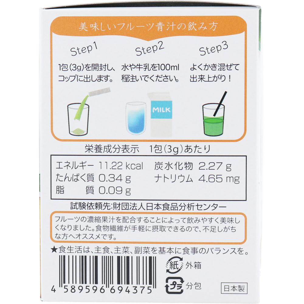 大麦若葉末(中国・日本)、ブドウ糖、デキストリン、オリゴ糖、オレンジ濃縮果汁、温州みかん濃縮果汁、植物醗酵エキス末、植物性乳酸菌/香料