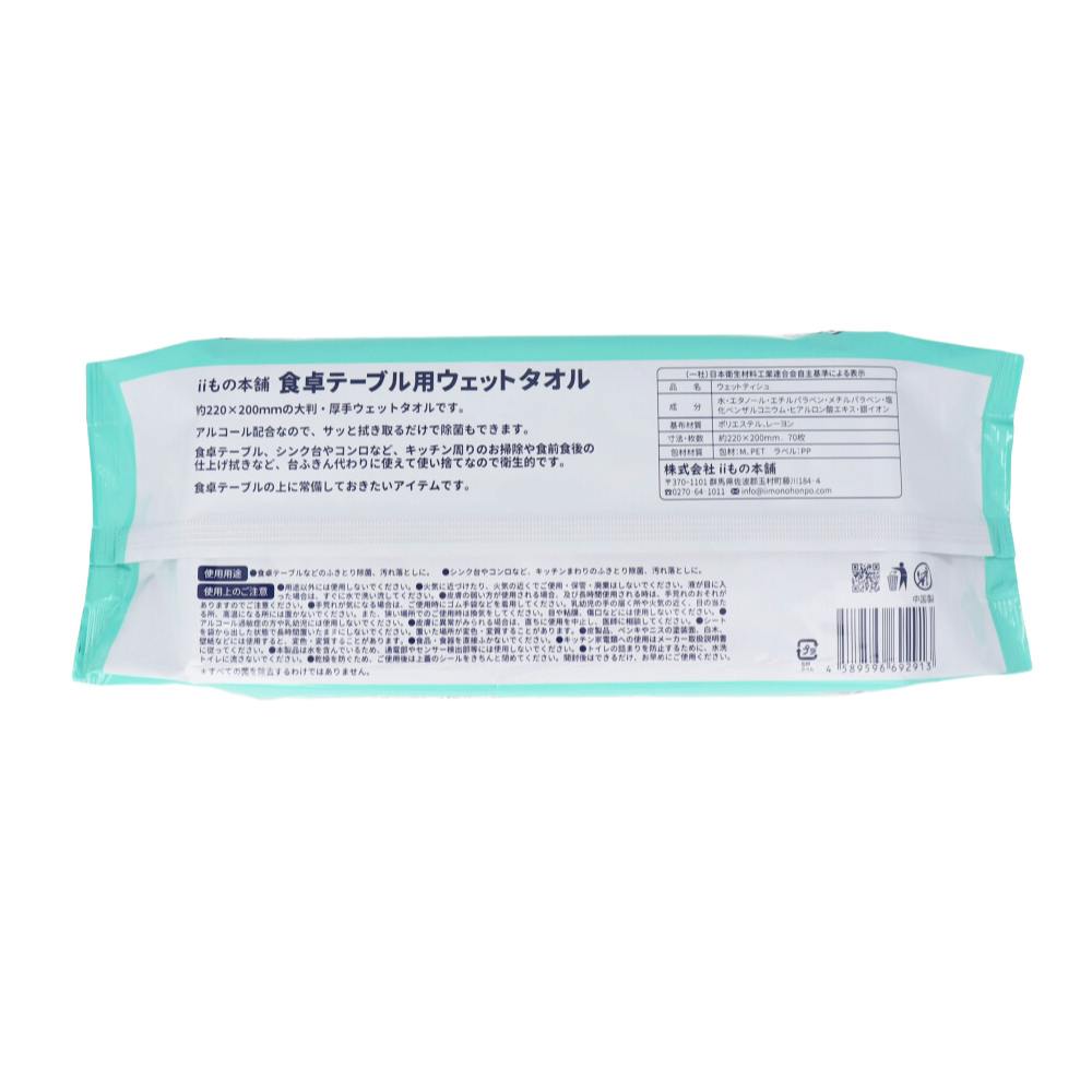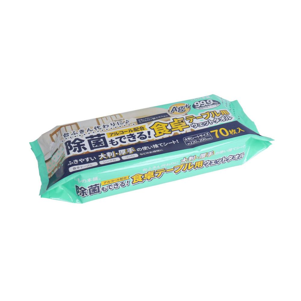台ふきん代わりに。ふきやすい大判・厚手の使い捨てシート!アルコール配合なので、サッと拭き取るだけで除菌もできます。約220×200mmの大判・厚手ウェットタオルです。●食卓テーブル、シンク台やコンロなど、キッチン周りのお掃除や食前食後の 仕上げ拭きなど、台ふきん代わりに使えて使い捨てなので衛生的です。●食卓テーブルの上に常備しておきたいアイテムです。●食卓テーブルなどのふきとり除菌、汚れ落としに。●シンク台やコンロなど、キッチンまわりのふきとり除菌、汚れ落としに。●70枚入×