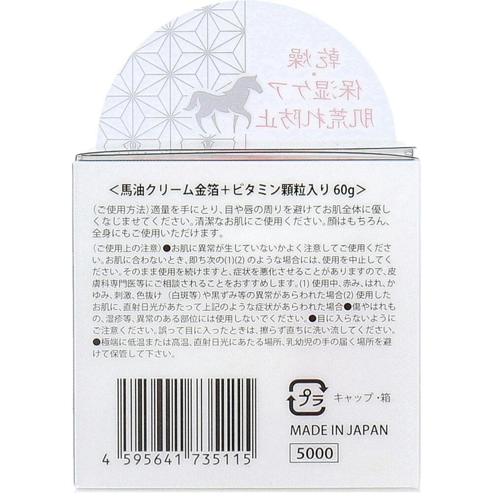 乾燥・保湿ケア、肌荒れ防止。馬油クリーム金箔+ビタミン顆粒入り。●馬油(保湿成分)。●金粉入り(整肌成分)。●ビタミン粒配合(整肌成分)。