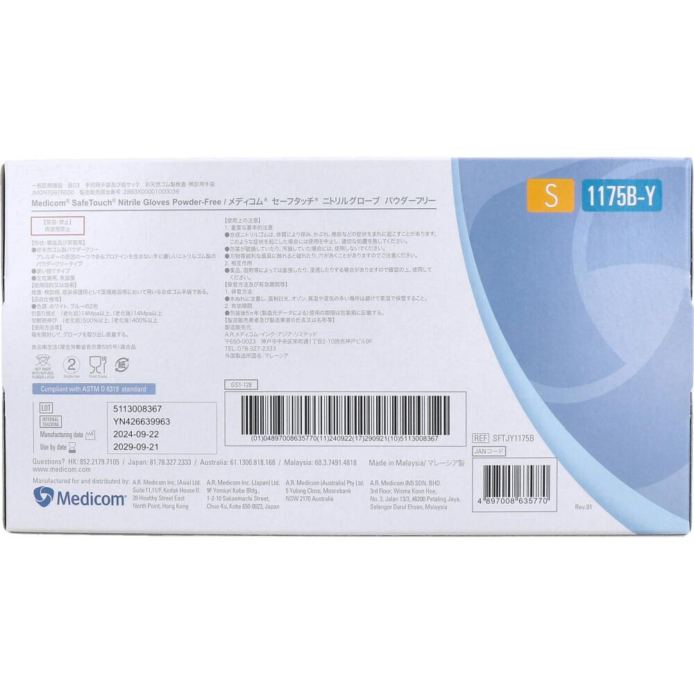 手術用手袋及び指サック非天然ゴム製検査・健診用手袋製造販売届出番号:28B3X00001000036販売名:メディコム セーフタッチ ニトリルグローブ パウダーフリー