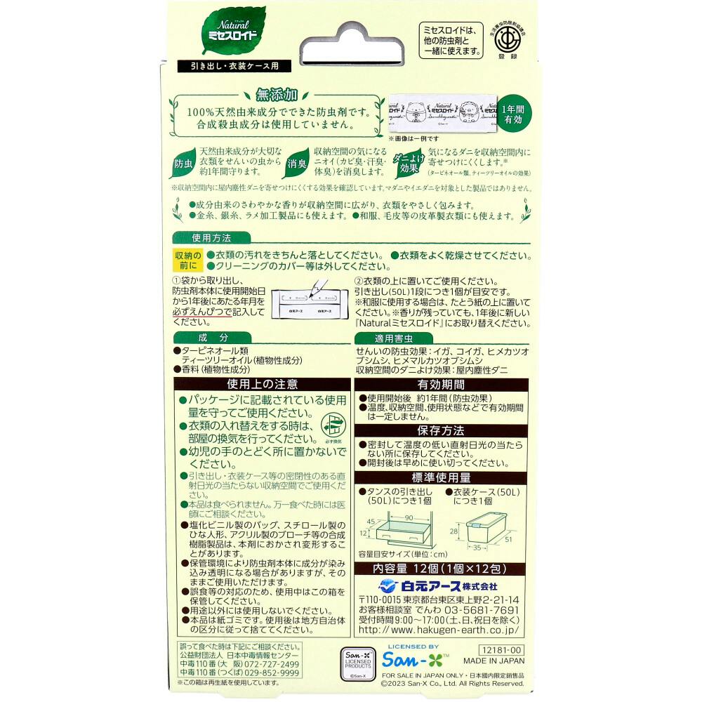 ナチュラル ミセスロイド 引き出し・衣装ケース用 無添加防虫剤 1年間有効 すみっコぐらし 12個入 ×1点【送料込み】 #4902407121813