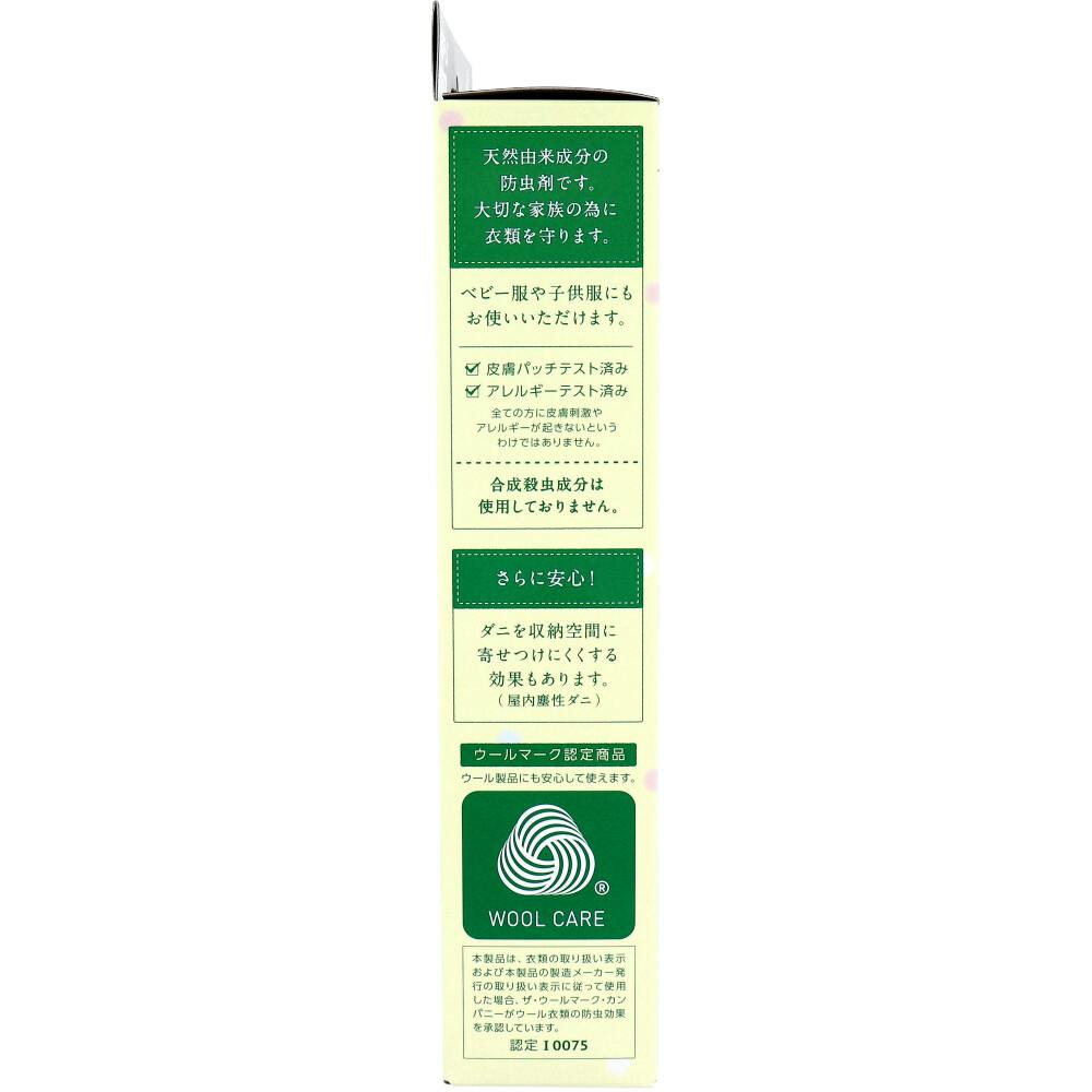 100%天然由来成分100%天然由来成分でできた防虫剤です。合成殺虫成分は使用していません。●天然由来成分が大切な衣類をせんいの虫から約1年間守ります。●収納空間の気になるニオイ(カビ臭、汗臭、体臭)を消臭します。●気になるダニを収納空間内に寄せつけにくくします。●成分由来のさわやかな香りが収納空間に広がり、衣類をやさしく包みます。●金糸、銀糸、ラメ加工製品にも使えます。●和服、毛皮等の皮革製衣類にも使えます。●皮膚パッチテスト・アレルギーテスト済み。※全ての方に皮膚刺激やア