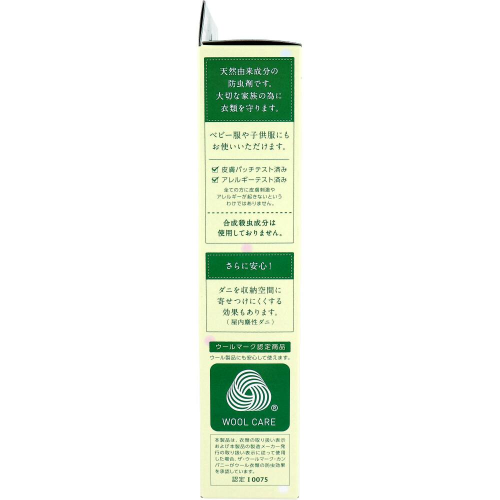 100%天然由来成分100%天然由来成分でできた防虫剤です。合成殺虫成分は使用していません。●天然由来成分が大切な衣類をせんいの虫から約1年間守ります。●収納空間の気になるニオイ(カビ臭、汗臭、体臭)を消臭します。●気になるダニを収納空間内に寄せつけにくくします。●成分由来のさわやかな香りが収納空間に広がり、衣類をやさしく包みます。●金糸、銀糸、ラメ加工製品にも使えます。●和服、毛皮等の皮革製衣類にも使えます。●皮膚パッチテスト・アレルギーテスト済み。※全ての方に皮膚刺激やア