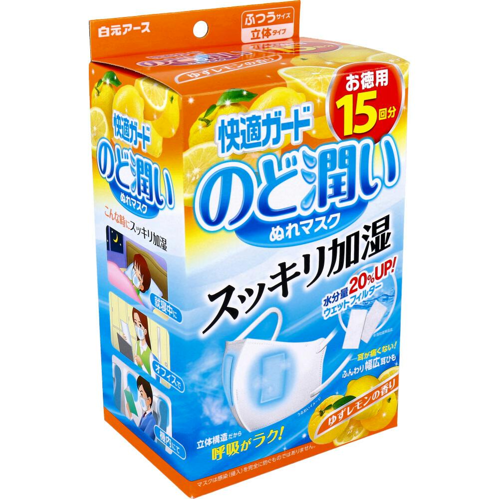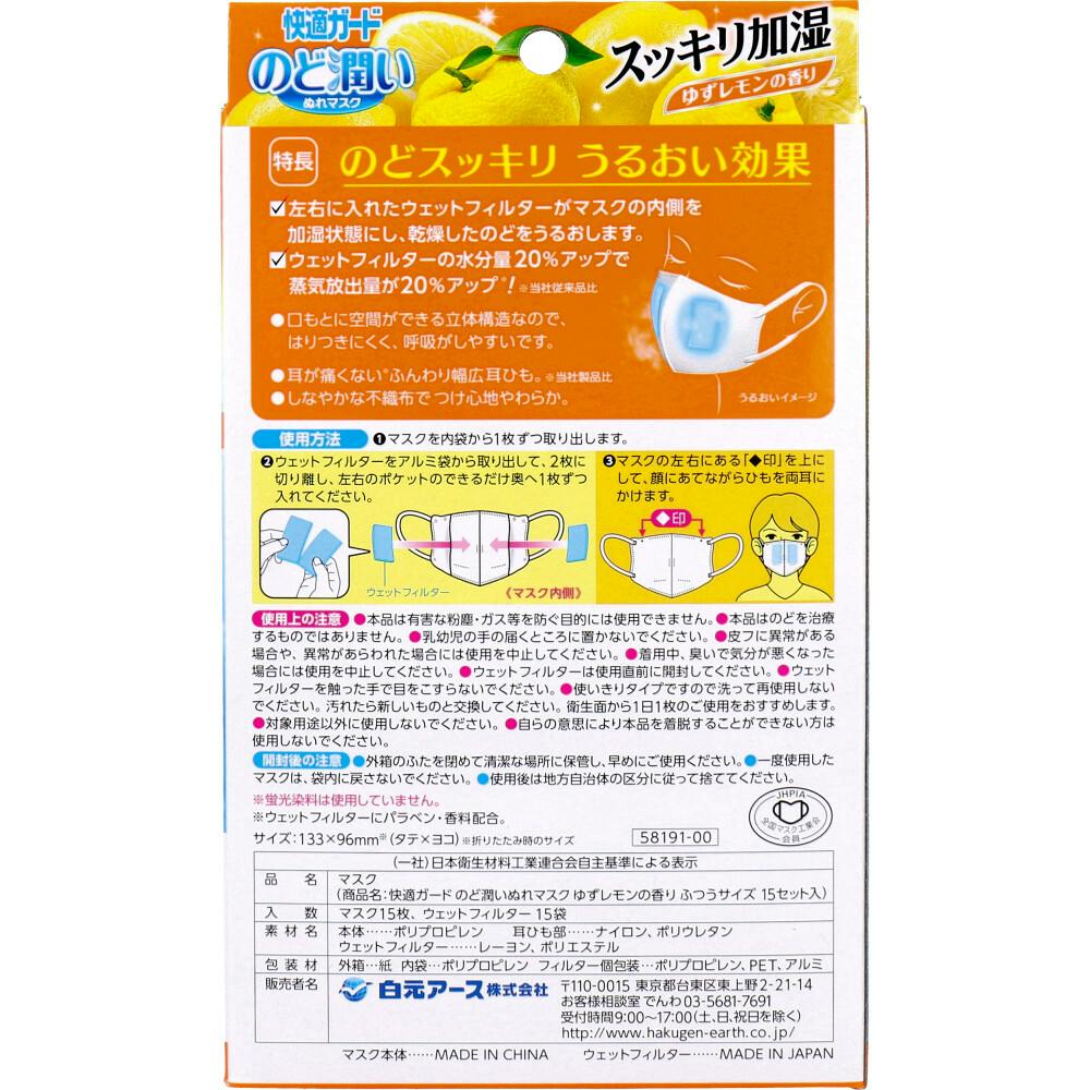 快適ガード のど潤いぬれマスク ゆずレモンの香り ふつうサイズ 15セット入 ×1点【送料込み】 #4902407581914