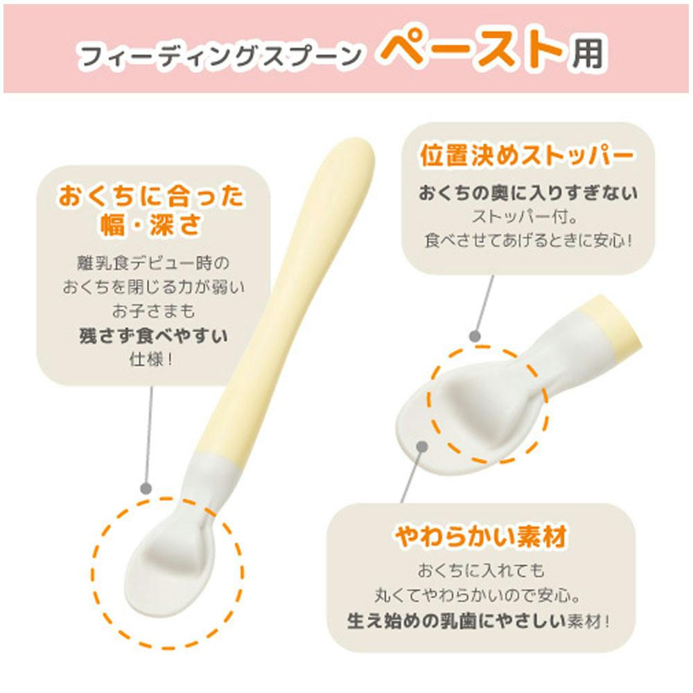 ,【原材料/耐熱温度】,柄:ポリプロピレン(耐熱温度105度)先端部:熱可塑性エラストマー(耐熱温度105度)ケース:ポリプロピレン(耐熱温度100度),【セット内容】,ペースト用スプーン、果汁・スープ用スプーン各1本、ケース,【消毒方法】,スプーン:煮沸:○/電子レンジ:○/薬液:○/食器洗い乾燥機:○※フィーディングスプーンの電子レンジ加熱は、溶けたり変形したりする原因になりますので、おやめください。(電子レンジ消毒はできます。)ケース:煮沸:×/電子レンジ:×/薬液:○