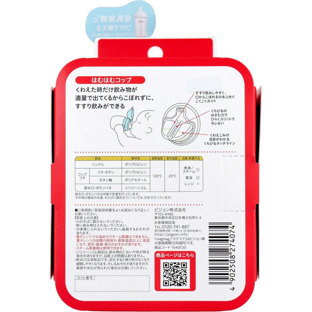 できた!を増やそう!コップ・ストロー、焦らないでゆっくりと。あなたのペースで「できた」が増えるたび、私も嬉しい。哺乳びんと行き来しながら成長できるマグマグシリーズ。●母乳実感につけて使える。(プラスチック製 240mL)●はむはむコップ。くわえた時だけ飲み物が適量で出てくるからこぼれずに、すすり飲みができる!●パッキン一体型の飲み口で洗いやすい。●食洗機OK。●6ヶ月頃から。