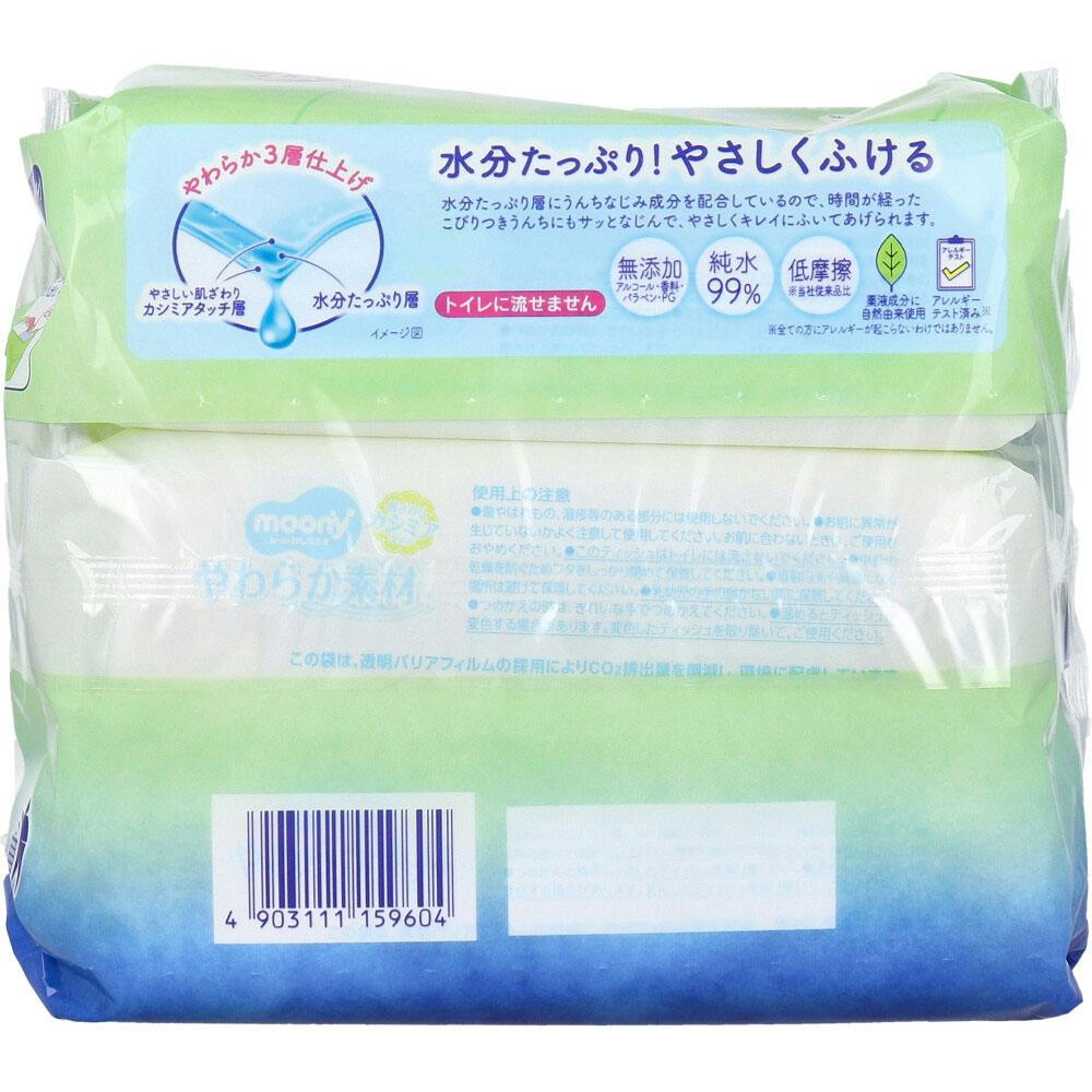 肌ざわりカシミアタッチ。水分たっぷりでしっかりふける!水分たっぷり層にうんちなじみ成分を配合しているので、時間が経ったこびりつきうんちにもサッとなじんで、やさしくキレイにふいてあげられます。●アルコール、香料、パラベン、PG 無添加。●純水99%。●低摩擦。※※ユニ・チャーム社従来品比●残り枚数が分かるお知らせサイン付き。●片手で開けやすく、ピタッと止まって取り出しやすい「ピタッとシール」搭載。●手や体にも使えます。
