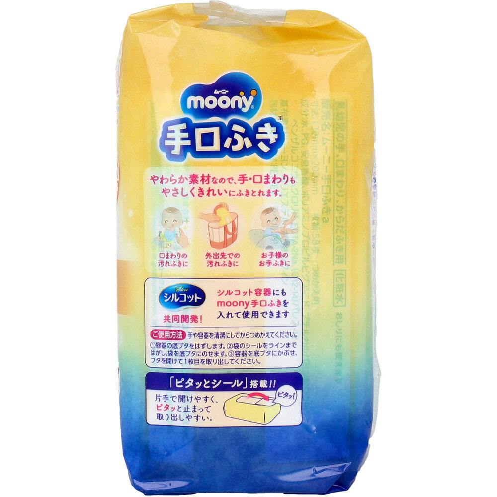 赤ちゃんにもあんしん♪さっと拭ける!やわらか素材!●やわらか素材なので、手・口まわりもやさしくきれいにふきとれます。口まわりの汚れふきに、外出先での汚れふきに、お子様のお手ふきに。●「ピタッとシール」搭載!!片手で開けやすく、ピタッと止まって取り出しやすい。●無添加(アルコール、香料、パラベン)、純水99%。●おしりにも使えます。※シルコット容器にもmoony手口ふきを入れて使用できます。