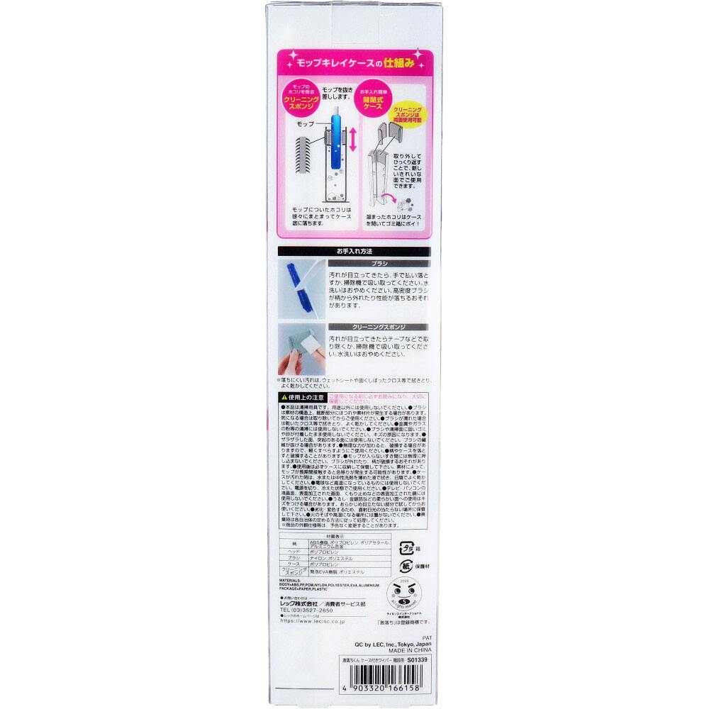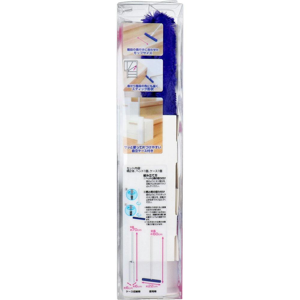 ケースに通すだけ。いつでもモップキレイ!溜まったホコリはまとめてポイ!階段の奥行きに合わせたモップサイズ。●狭い階段でも取り回しのしやすいショート柄タイプです。ショート柄だから階段の段差にちょうどいい!●スティック形状のモップなので、曲がり階段の角等にも届きやすいです。●モップはケースに通すとキレイになり、ホコリは徐々にまとまって溜まります。●ケースがパカっと大きく開くので、溜まったホコリを簡単に捨てられます。●自立して収納できるケース付きなので、手に取りやすい場所に置きやす