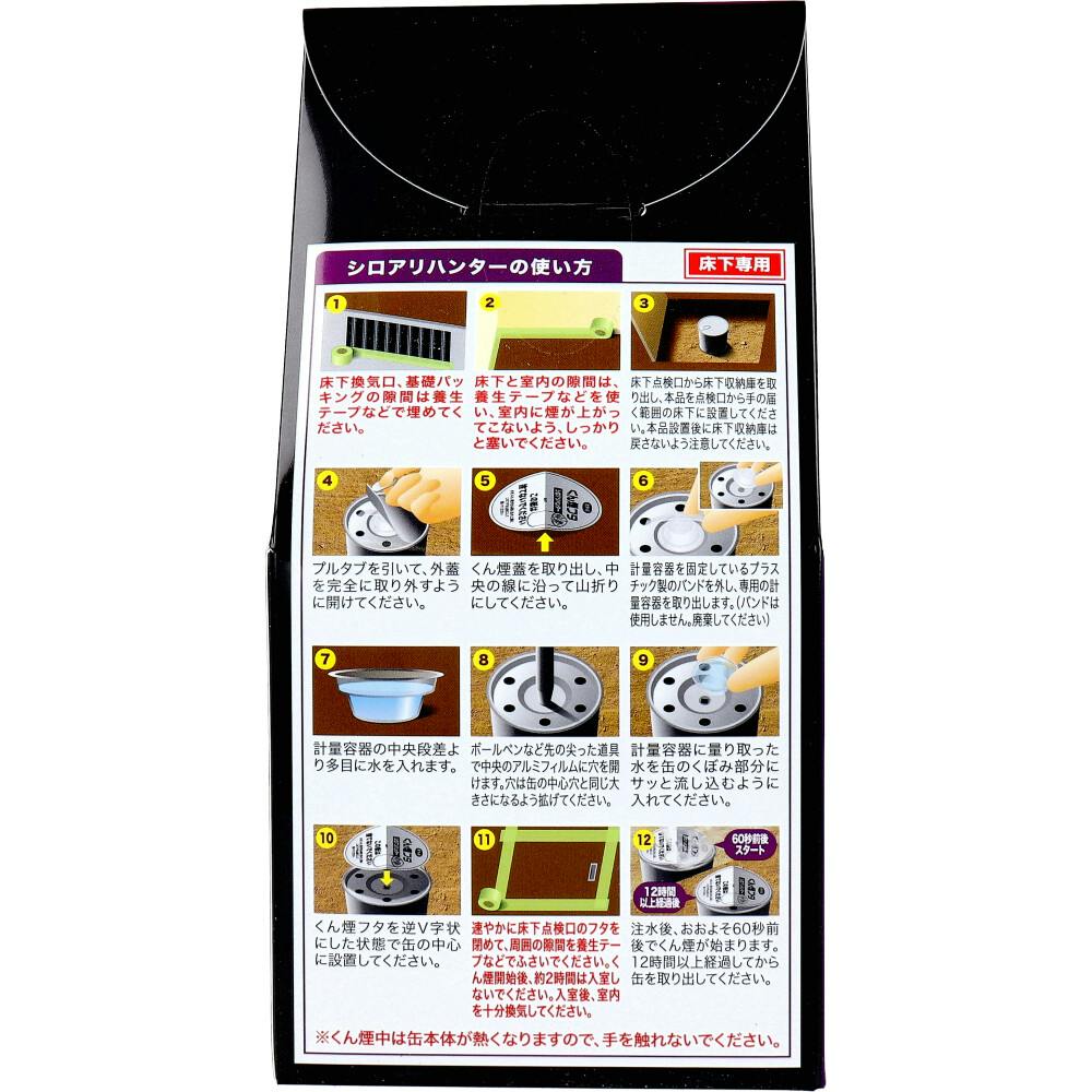 (1)床下換気口、基礎パッキングの隙間は養生テープなどで埋めてください。(2)床下と室内の隙間は養生テープなどを使い、室内に煙が上がってこないよう、しっかりと塞いでください。(3)床下点検口から床下収納庫を取り出し、本品を点検口から手の届く範囲の床下に設置してください。本品設置後に床下収納庫は戻さないよう注意してください。(4)プルタブを引いて、外蓋を完全に取り外すように開けてください。(5)くん煙蓋を取り出し、中央の線に沿って山折りにしてください。(6)計量容器を固定してい