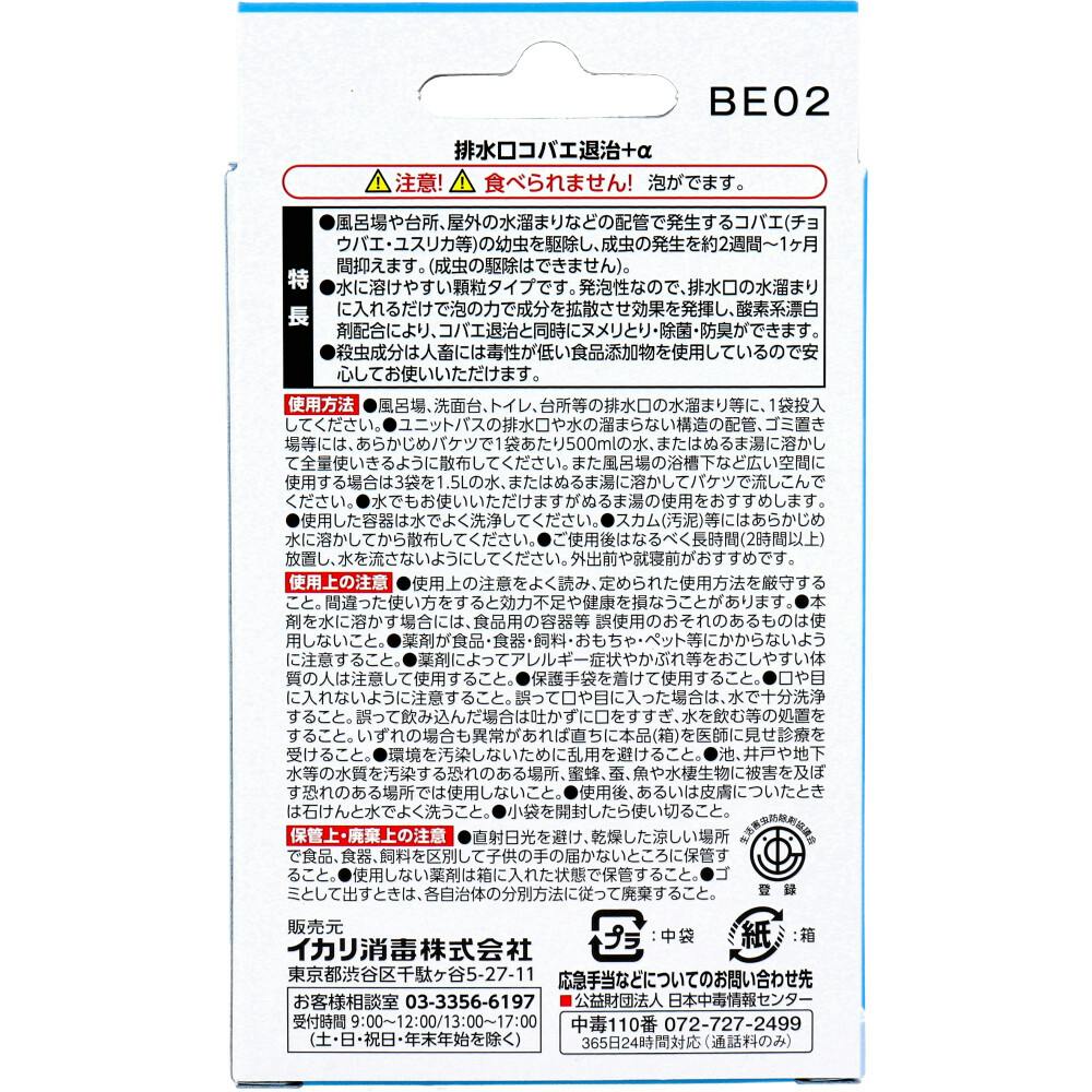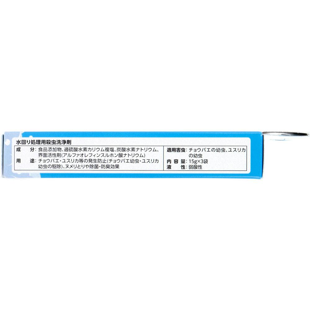 幼虫退治+ヌメリ取り殺虫成分不使用●風呂場や台所、屋外の水溜まりなどの配管で発生するコバエ(チョウバエ・ユスリカ等)の幼虫を駆除し、成虫の発生を約2週間~1ヶ月間抑えます。(成虫の駆除はできません)。●水に溶けやすい顆粒タイプです。発泡性なので、排水口の水溜りに入れるだけで泡の力で成分を拡散させ効果を発揮し、酸素系漂白剤配合により、コバエ退治と同時にヌメリとり・除菌・防臭ができます。●殺虫成分は人畜には毒性が低い食品添加物を使用しているので安心してお使いいただけます。●流しの
