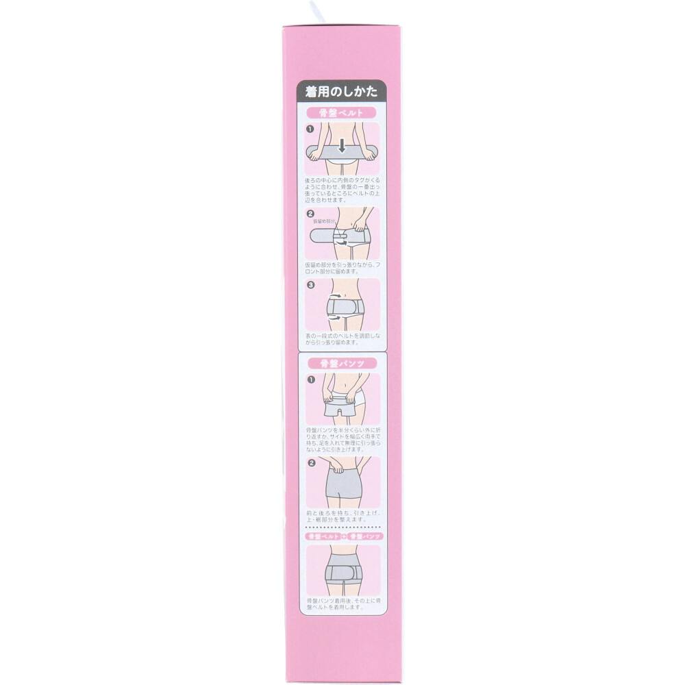 ★骨盤ベルト(1)後ろの中心に内側のタグがくるように合わせ、骨盤の一番出っ張っているところにベルトの上辺を合わせます。(2)仮留め部分を引っ張りながら、フロント部分に留めます。(3)表の一段式のベルトを調節しながら引っ張り留めます。★骨盤パンツ(1)骨盤パンツを半分くらい外に折り返すか、サイドを幅広く両手で持ち、足を入れて無理に引っ張らないように引き上げます。(2)前と後ろを持ち、引き上げ、上・裾部分を整えます。★骨盤ベルト+骨盤パンツ骨盤パンツ着用後、その上に骨盤ベルトを着