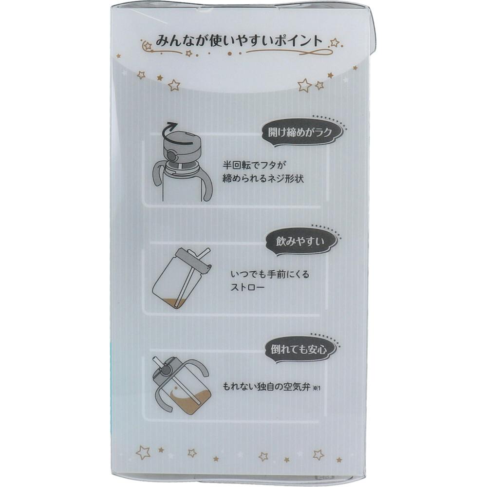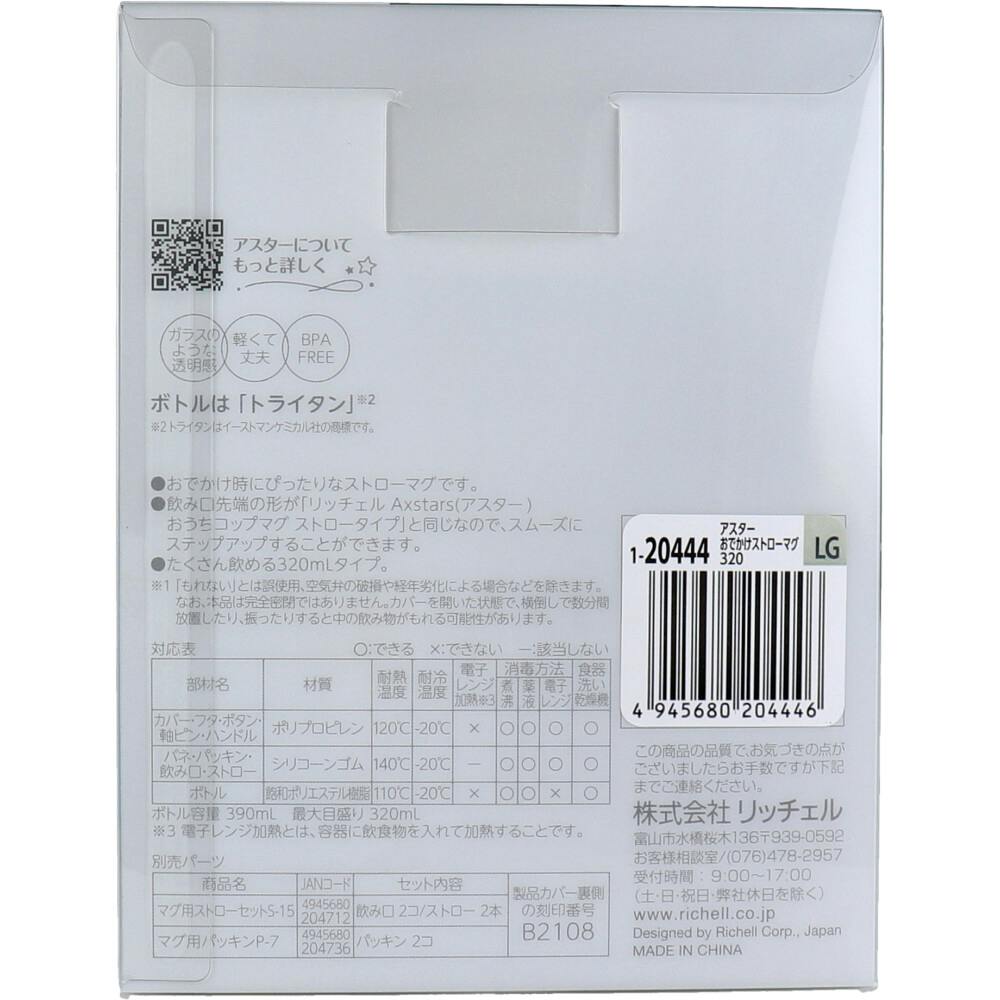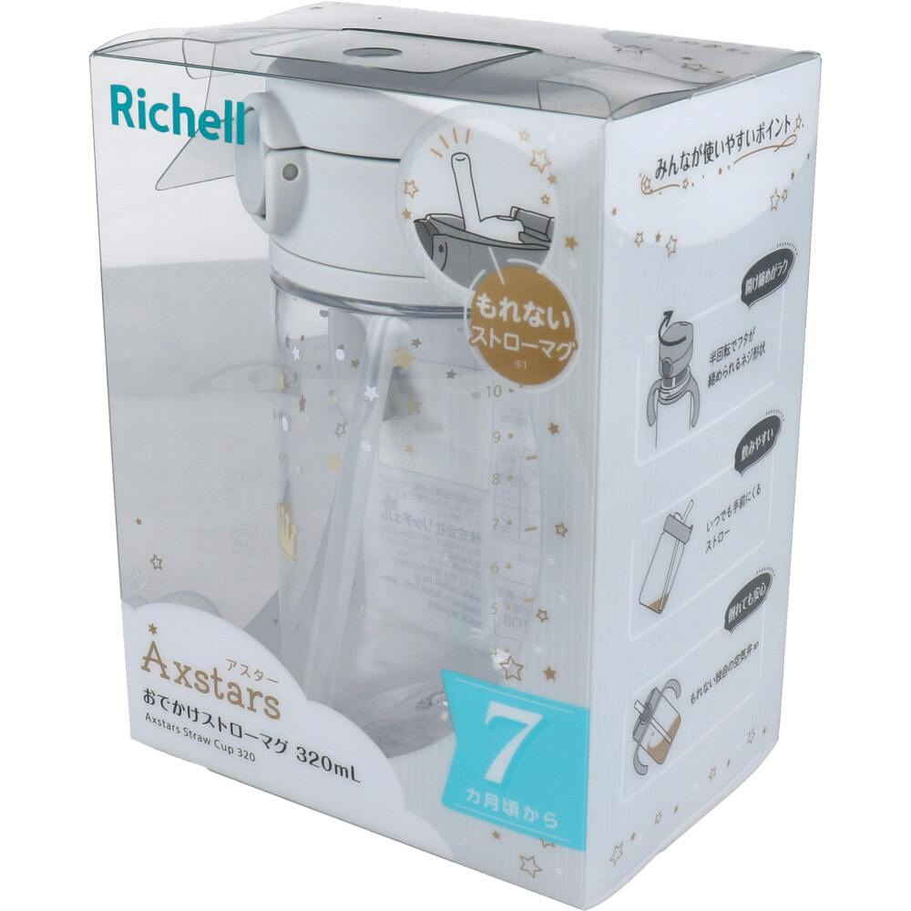 もれないストローマグボトル内のストローがいつでも手前にくるストローマグです。●お出かけ時にぴったりなストローマグです。●飲み口先端の形が「リッチェルAxstars(アスター)おうちコップマグストロータイプ」と同じなので、スムーズにステップアップすることができます。●たくさん飲める320mLタイプ。●手前にくるストロー。ボトル内のストローが、いつでも手前にくるので、最後まで飲みきることができます。●開け締めがラク。半回転でフタが締められるネジ形状です。●ガラスのような透明感。素