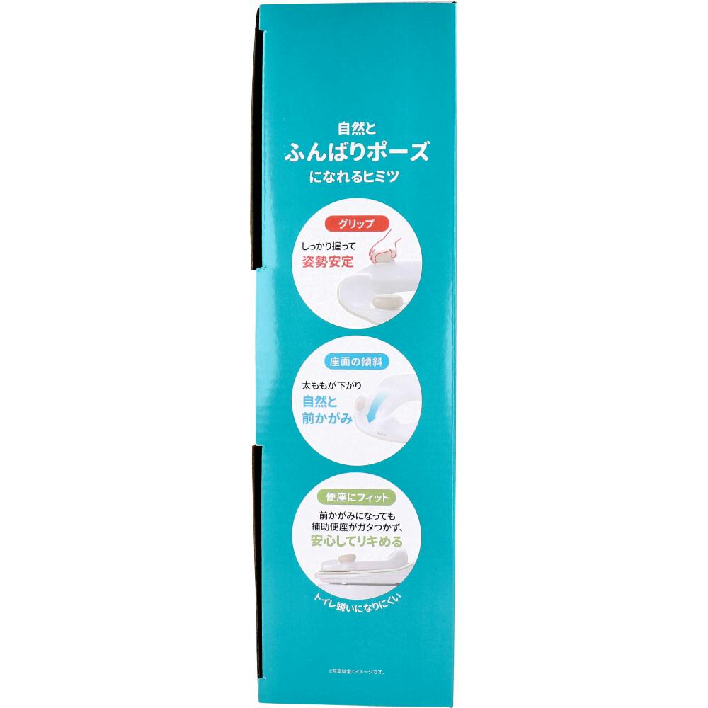 できた!のカギはふんばりポーズ。またがず座るスタイルで大人トイレにスムーズ移行。正しい姿勢でトイレ上達!●自然とふんばりポーズになれるヒミツ。・グリップ:しっかり握って姿勢安定。・座面の傾斜:太ももが下がり自然と前かがみ。・便座にフィット:前かがみになっても補助便座がガタつかず、安心してリキめる。●「イス型」のワケ・座らせやすい:股を広げるのを嫌がる赤ちゃんでも、ラクに座らせることができます。・リキみやすい:足を大きく開く、またぐタイプに比べ、足を閉じてリキみやすい姿勢がとれ