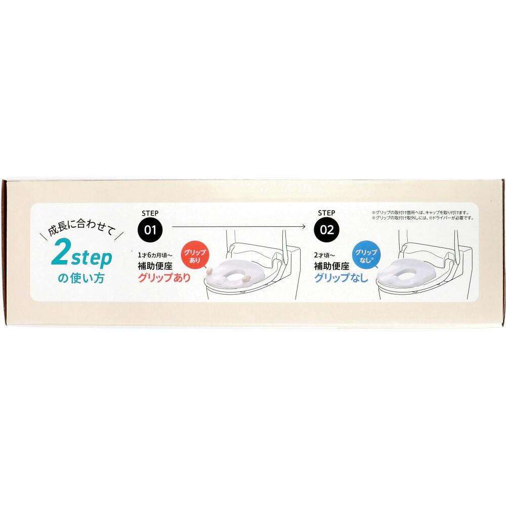 ます。足を閉じて座る姿勢で、大人用トイレに早く慣れることができます。●取り外せるグリップ:補助便座時には、取り外しても使用できます。※取り外した箇所には、キャップを取り付けます。●やわらか便座ガード:横滑り、大人用便座へのキズを防ぎます。●固定具付き:便座裏にしっかり固定できるので、転倒やぐらつきを防ぎます。●成長に合わせて2stepの使い方。(1)1才6か月頃~:補助便座グリップあり。(3)2才頃~:補助便座グリップなし。★