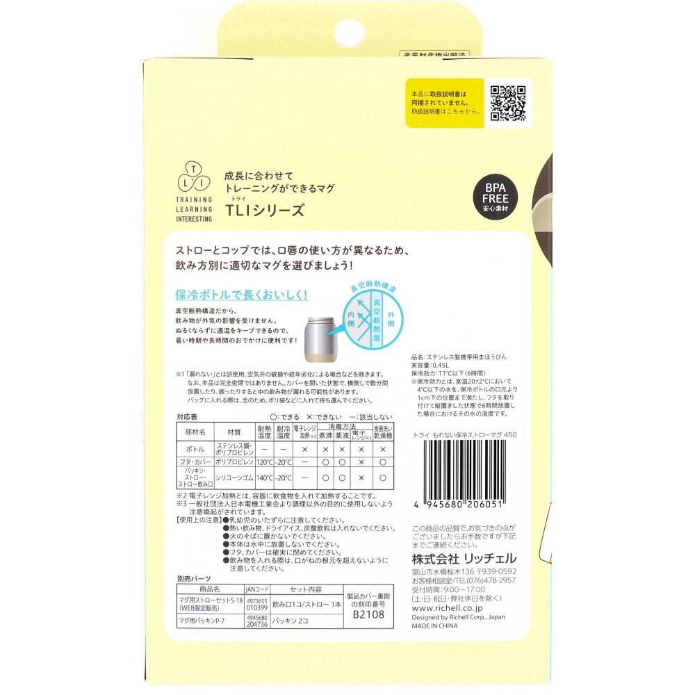 手前にくるので、最後まで飲みきることができます。●角度のついたハンドル。ハンドルが手前に傾いているので、自分で飲みやすいです。●ひんやりキープ。真空断熱構造なので、飲み物が外気の影響を受けず、適温をキープできます。●別売パーツでコップマグに。トライ のみやすいコップマグパーツ(別売り)に付け替えて、コップ飲みマグにできます。●食器洗い乾燥機OK(ボトルを除く)、煮沸・薬液消毒OK(ボトルを除く)。