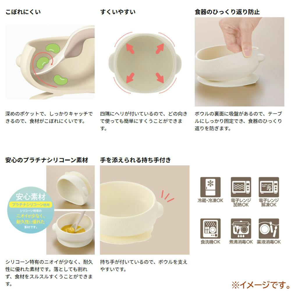 手を添えられる持ち手付きの食器です。安心のプラチナシリコーン素材シリコーン特有のニオイが少なく、耐久性に優れた素材です。●こぼれにくい。深めのポケットで、しっかりキャッチできるので、食材がこぼれにくいです。●すくいやすい。四隅にヘリが付いているので、どの向きで使っても簡単にすくうことができます。●食器のひっくり返り防止。ボウル裏面に吸盤があるので、テーブルにしっかり固定でき、食器のひっくり返りを防ぎます。●手を添えられる持ち手付き。持ち手が付いているので、ボウルを支えやすいで