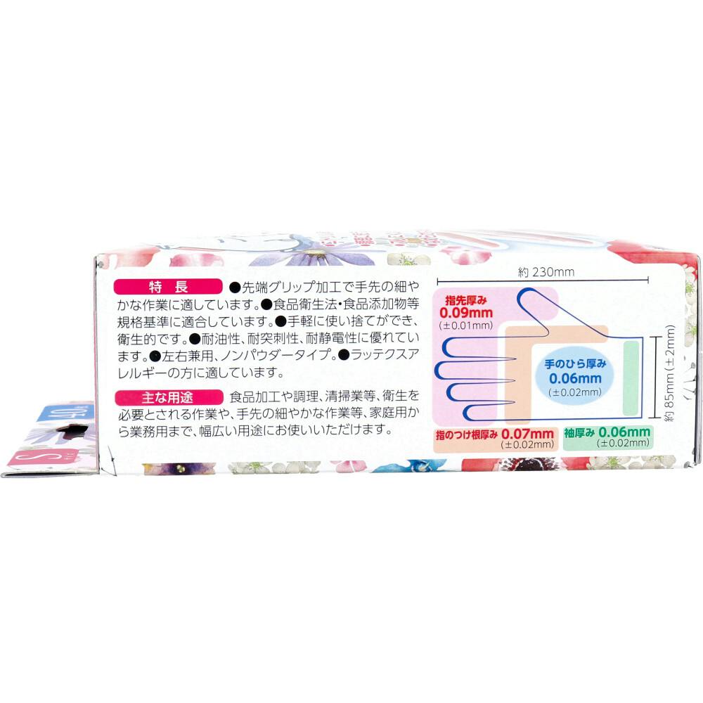 つらい手荒れにやさしい。幅広い用途に使えるニトリル素材の使い捨て手袋!調理に使える。ぴったりフィットでズレにくい。なめらかな着脱。●先端グリップ加工で手先の細やかな作業に適しています。●食品衛生法・食品添加物等規格基準に適合しています。●手軽に使い捨てができ、衛生的です。●耐油性、耐突刺性、耐静電性に優れています。●左右兼用、ノンパウダータイプ。●ラテックスアレルギーの方に適しています。●置き場所に困らない、小さめの箱サイズ。●裏面が蓋付取り出し口で、ほこり等が中に入りにくい