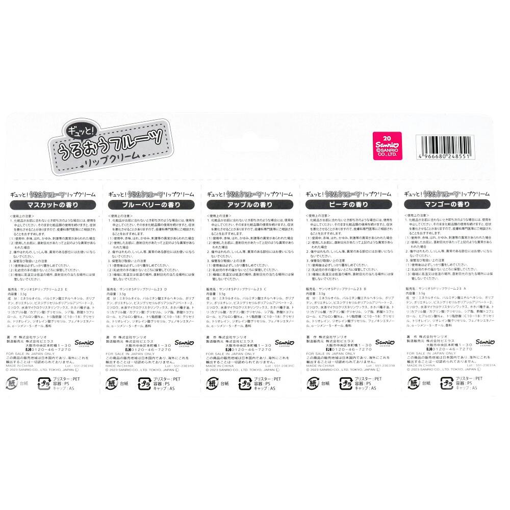 サンリオ人気キャラクターがリップになって登場♪キリトリ線入りだからお土産やプレゼントに最適です♪●ヒアルロン酸・ホホバオイル・シアバター・ビタミンEの4つのくちびるに嬉しい成分を配合しています。●マンゴー(ポムポムプリン)・ピーチ(マイメロディ)・アップル(ハローキティ)・ブルーベリー(クロミ)・マスカット(シナモロール)の5種類の香りです。