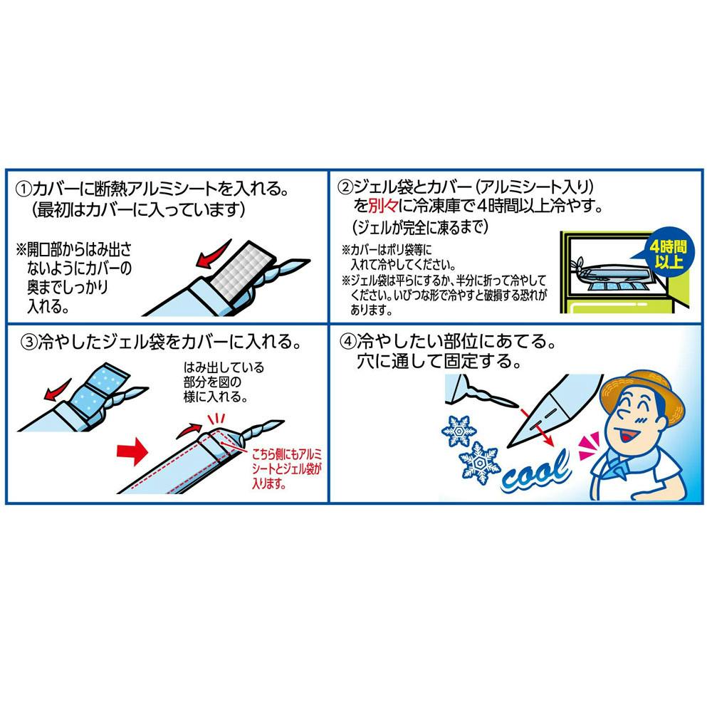 (1)カバーに断熱アルミシートを入れる。(最初はカバーに入っています。)※開口部からはみ出さないようにカバーの奥までしっかり入れる。(2)ジェル袋とカバー(アルミシート入り)を別々に冷凍庫で約4時間以上冷やす。(ジェルが完全に凍るまで)※カバーはポリ袋等に入れて冷やしてください。※ジェル袋は平らにするか、半分に折って冷やしてください。いびつな形で冷やすと破損する恐れがあります。(3)冷やしたジェル袋をカバーに入れる。(4)冷やしたい部位にあてる。穴に通して固定する。