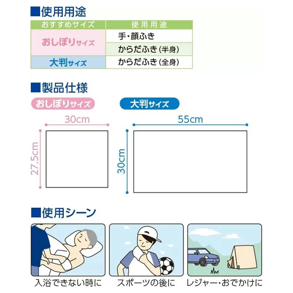 手・顔を拭くのに便利!温めても冷やしても使用できる 個包装のからだふき用ぬれタオル。やわらかく強度のある不織布に保湿成分「グリコシルトレハロース」を配合した、スティックタイプのからだ拭き用ぬれタオルです。●強度と厚みのある基布。コットンの風合いと強度のある不織布を使用しているため、肌ざわりが良くしっかりした拭き応えがあります。●保湿成分 グレコシルトレハロース配合。清拭直後は「しっとり」、乾燥後は「さっぱり」快適な使用感です。●ホットでもクールでも快適使用。個包装で、温めたり