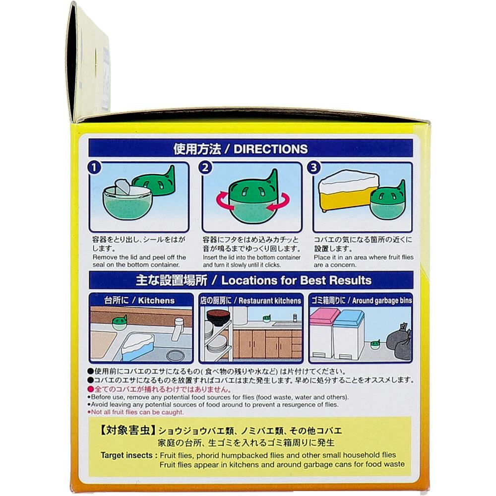(1)容器をとりだし、シールをはがします。(2)容器にフタをはめ込みカチッと音が鳴るまでゆっくり回します。(3)コバエの気になる箇所の近くに設置します。主な設置場所:台所に、店の厨房に、ゴミ箱周りに。※使用前にコバエのエサになるもの(食べ物の残りや水など)は片付けてください。※コバエのエサになるものを放置すればコバエはまた発生します。早めに処分することをオススメします。※全てのコバエが捕れるわけではありません。