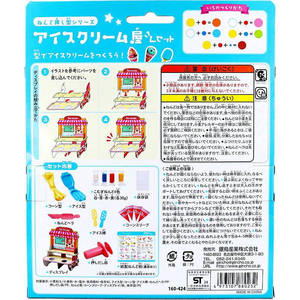 小麦粘土:小麦粉、水、塩分、食用顔料、保存料アイス型、コーン型、アイス棒、ねんどヘラ:PP押しだし器:PEねんど板、コーンスリーブ、ディスプレイ:紙保存袋:PE