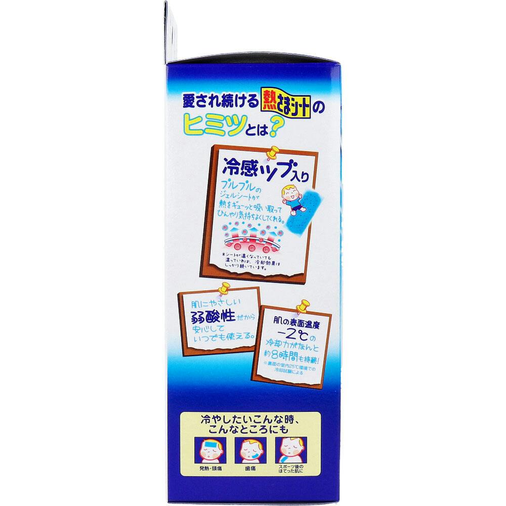 水分たっぷりジェルが熱をギューッと吸い取る。お子さまの急な発熱に、そのまますぐに使える。●冷感ツブ入りジェルシートで冷却力が約8時間。●ピタッとおでこに密着。寝返りをうってもはがれにくい。●肌にやさしい弱酸性シート。●冷やしたいこんな時、こんなところにも。発熱・頭痛、歯痛、スポーツ後のほてった肌に。★なが~くはたらく熱さまシートのこだわり。(1)熱を取るこだわり:熱さまシートに含まれるたっぷりの水分が熱を吸って蒸発するので、約8時間後でも変わらず肌の温度を-2度冷やし続けます