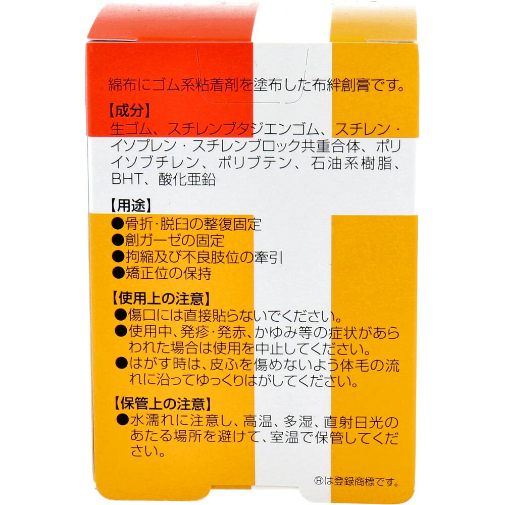 綿布にゴム系粘着剤を塗布した布絆創膏です!強度のある綿布のテープ。大きな接着強度があります。矯正位の保持や骨折・脱臼の整復など、固定力が必要な用途に。●高固定性:強度が高い綿布の基材と、粘着力の高いゴム系粘着剤を使用しています。
