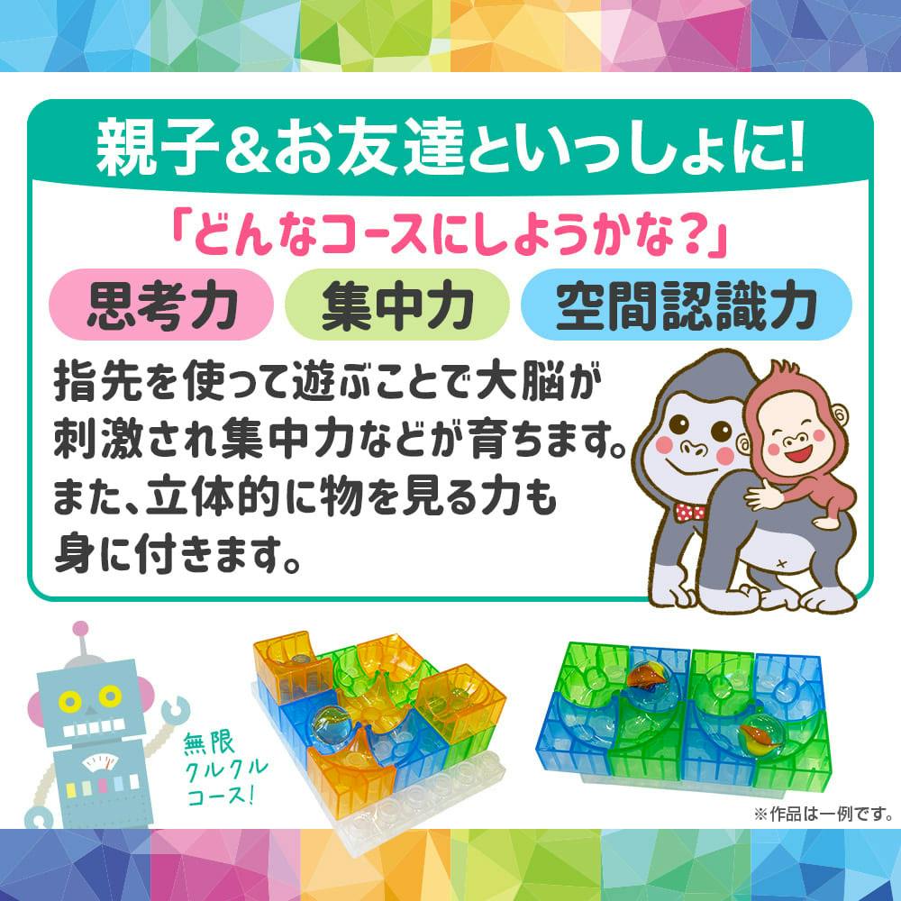 コースは無限大!かんがえてためしてつくってみよう!コースターをコロりん、クルクルかけぬける!ブロックだけでも自由に楽しめます。★親子&お友達といっしょに!(観察力・集中力・空間認識力)指先を使って遊ぶことで大脳が刺激され、集中力などが育ちます。また、立体的に物を見る力も身に付きます。