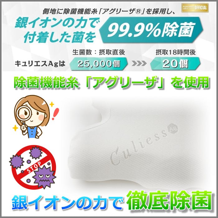 【徹底除菌】カバーには東洋紡株式会社が開発した除菌機能糸「アグリーザ」を使用しているため繊維に含まれる銀イオンにより除菌機能を発揮します。