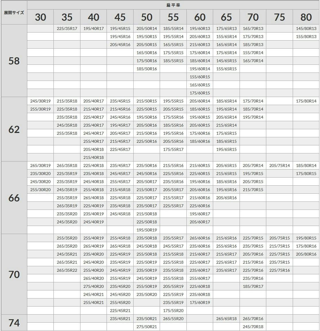 58サイズ:ピクシスエポック / ヤリス / ルーミーなど<br>62サイズ:シエンタ / カローラツーリング / カローラスポーツ / GR86など<br>66サイズ:プリウス / ノア / ヴォクシー / カローラクロス / GRヤリスなど<br>70サイズ:クラウンクロスオーバー / ハリアー / RAV4など<br>74サイズ:ハイラックス / ランドクルーザー300 / ランドクルーザー250など<br>