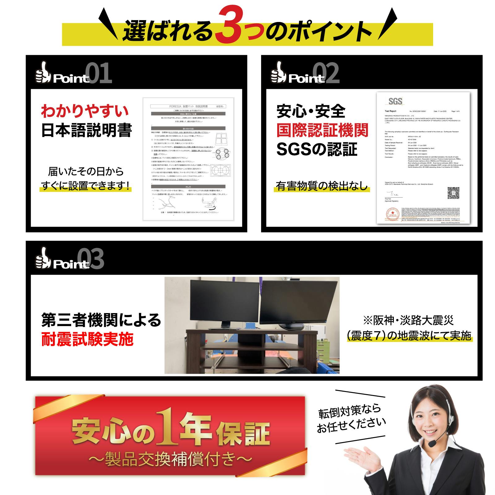 震度7を記録した阪神淡路大震災の地震波にて、振動試験を実施済。液晶テレビや電子レンジを始めとして、パソコンやオーディオなどの小型家電や花瓶・水槽・植木鉢などのインテリアの固定に最適です。透明クリアタイプで、見た目も目立ちません。突っ張り棒の滑り止めや、引き出しの中の小分けケースの固定にも便利にご使用頂けます。
