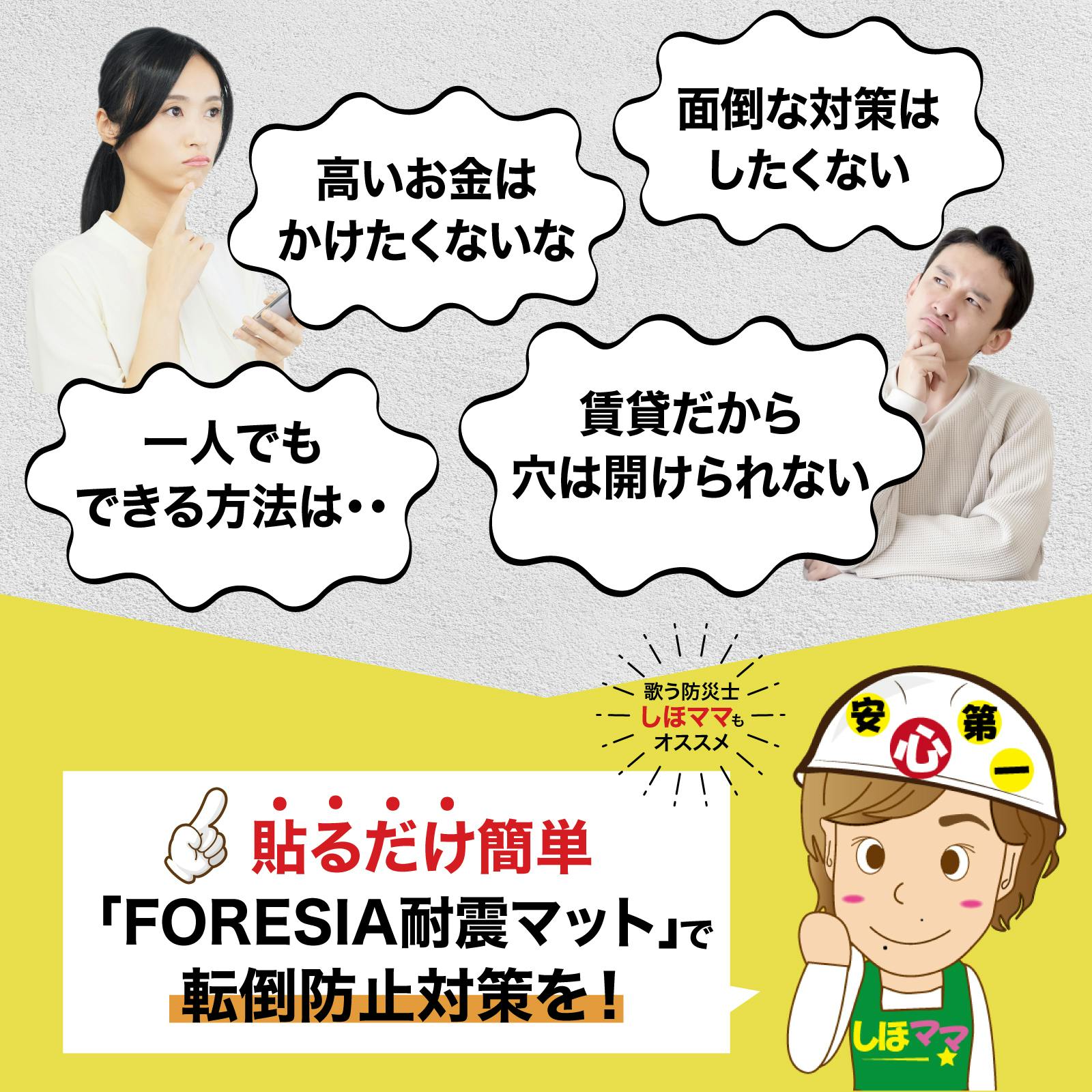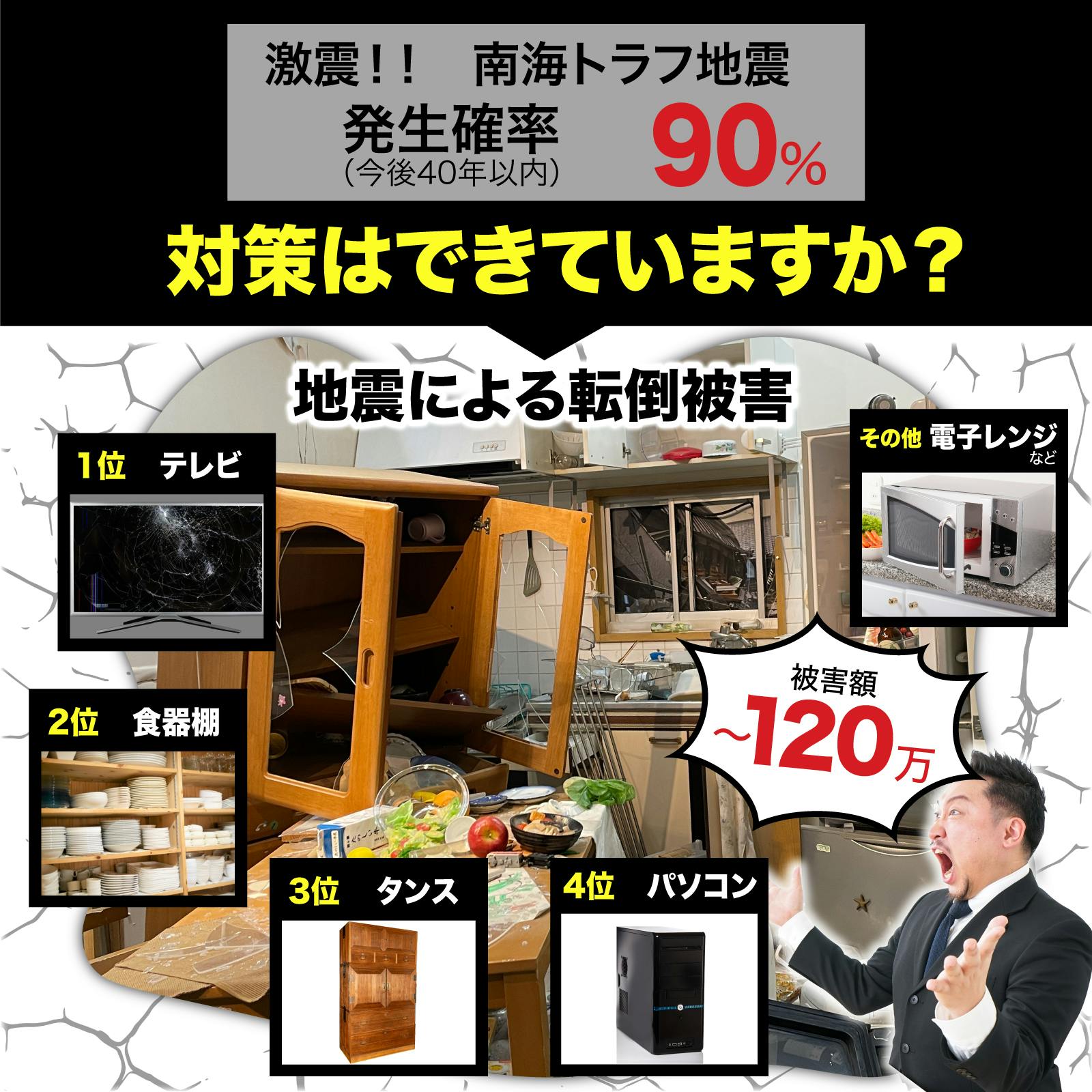 ・家財底面と耐震マットの触れる面積が小さい場合は、耐荷重が少なくなります ・本製品で物を吊り下げないでください ・フッ素樹脂加工など撥水性のものには使用できません(セロハンテープがしっかり付く面は使用可)・木材などの凹凸のある面やざらざらした面には適しません・本製品は地震の被害を最小限に抑える商品です。 本製品使用により発生した破損事故や地震による損害に対して責任を負うものではありません