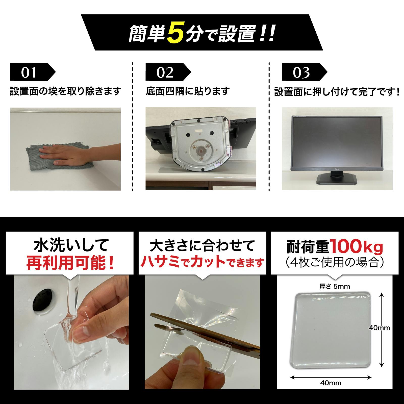 驚異の粘着力により、貼るだけで転倒対策ができます。賃貸住宅で穴を開けられない場合でも、工事不要で設置することが可能です。厚さ5mmで耐荷重100kg(4枚ご使用時)の耐震ジェルです。子供やペットのいたずらによる、転倒防止にも役立ちます。