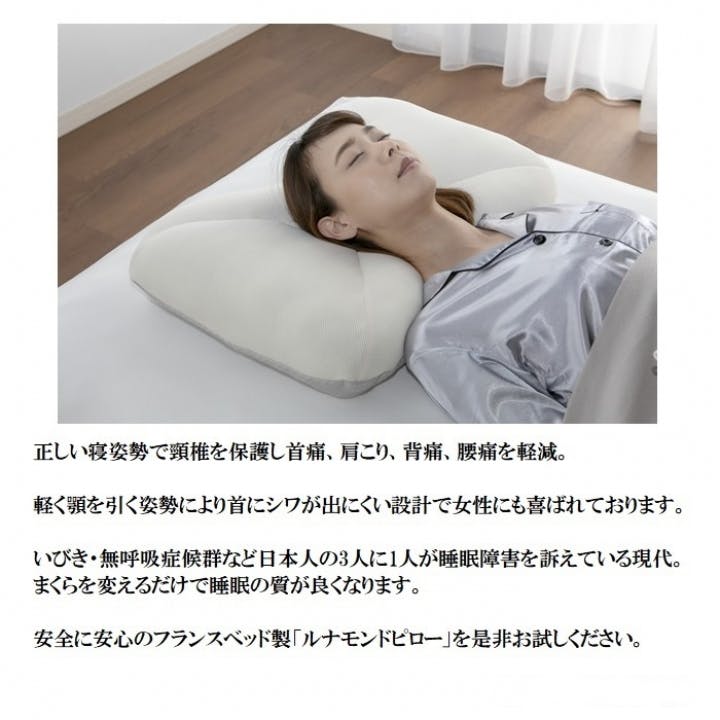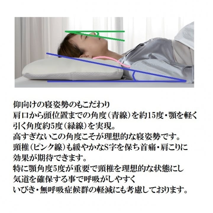 頸椎のS字カーブを正しく保ち首痛、肩こりを軽減。気道も確保され呼吸がしやすく、いびき・無呼吸症候群の予防に期待にもできます。また首にシワが出にくく女性に喜ばれております。サイド部分が盛り上がる仕様で横向き寝姿勢時に優しく頬を支え真っすぐな頸椎を維持します。仰向け、横向けどちらでも安心しておやすみいただけます。