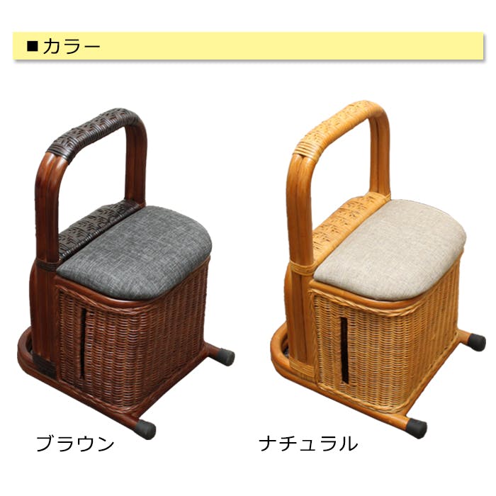 立ち上がる時や腰を下ろすときに便利なラタン製ステッキ。腰や膝の負担を軽減して楽に立ち上がる事ができます。小物類を入れておける収納付き。収納の片側はティッシュペーパーBOXになっています。収納のフタはクッションになっており、肘掛けとしても使えます。※天然素材の為、籐の一部に木目の節のような部分がありますが不良ではございません。
